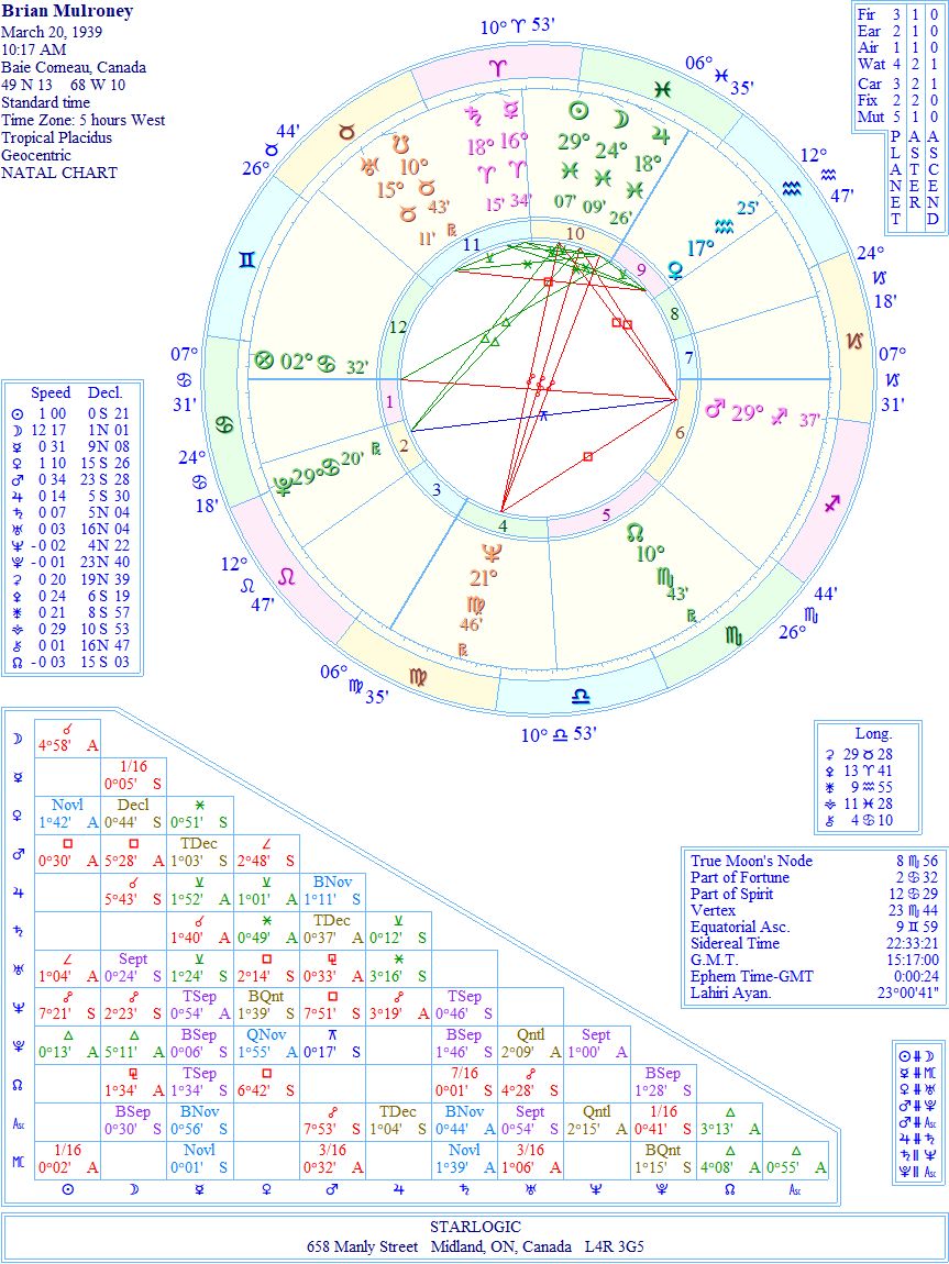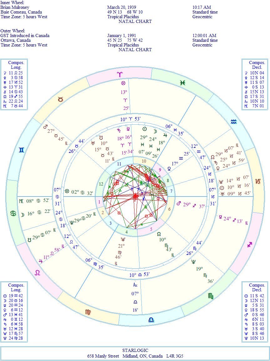 The Sun/Moon conjunction speaks to the man’s popularity. The Mars/Pluto inconjunct tells us that he would not be dissuaded from anything he deemed good for the country, including a free trade agreement with the States (NAFTA). But his greatest achievement was a very unpopular one, at the time: he introduced the federal Goods & Services Tax. Comparing his birth chart with the event chart allows us to see that this legislation was his crowning achievement.