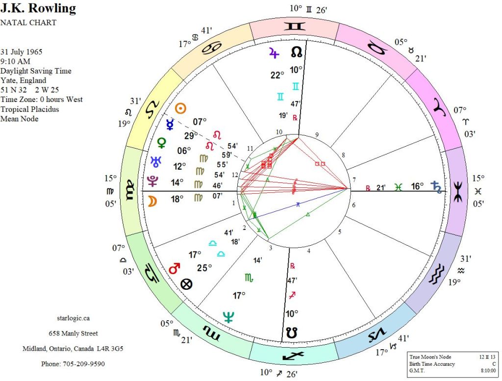 Contrary to the rectified time, Pluto in the 12th House (of the Unconscious) seems to be confirmed by this video discussion between J.K. Rowling and Stephen Fry. And the Moon in the 1st House (of Personality) speaks to her tremendous popularity as an author. But, just to keep things in context, Saturn at about age 25, seems to match the hardship she was facing which was triggered by her mother’s illness and her father’s emotional abandonment.