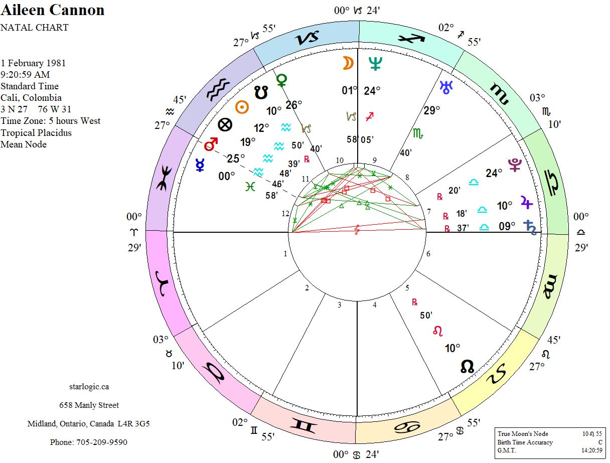 I haven’t tried to raise her birth chart previously, because no reputable online sites have ever listed her birth date. Judge Aileen Cannon seems to be a mysterious individual to most legal pundits, but the website Medium seemingly got hold of her birth details and raised a chart for 12 noon.