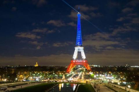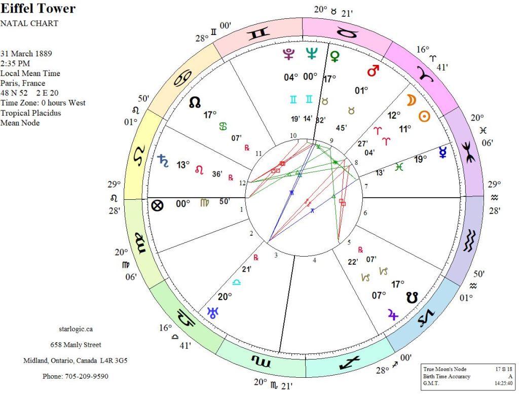 Interesting: the Yod pointing at Uranus, is formed by inconjuncts of Mercury, Venus and the Midheaven. Notice how the Sun and Moon are conjunct and widely in opposition to Uranus. These days the Tower is lit at night with the colours of the French flag.