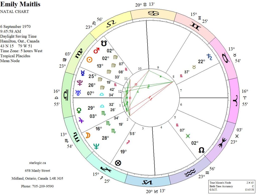 The timing is entirely randomized. Notice that there are no inconjuncts. That South Node conjunct Mars @ 2° Virgo tells me that she was a warrior in a past life. The stellium of planets/lights in Virgo (in the 11th and 12th Houses) gives a truth seeking feeling to her chart. Saturn in opposition is halfway between the Moon and Neptune. When Emily mentions in the longer video that she was nothing but a conduit for women who wanted to know why Andrew did what he did, the Moon/Venus placement in opposition to Saturn becomes her ‘speaking truth to power.’