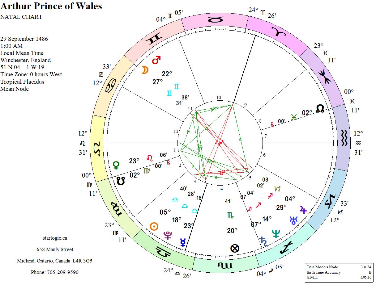 This time is considered reliable, which, when it comes to British Royalty, is relatively mediocre. But the reason for that ambiguity seems to be down to the fact that Arthur was born in the middle of the night and no one knows whether it was the 19th or the 20th of September. I’ve opted for the 20th @ 1 am as this would be the closest to midnight between those two dates.