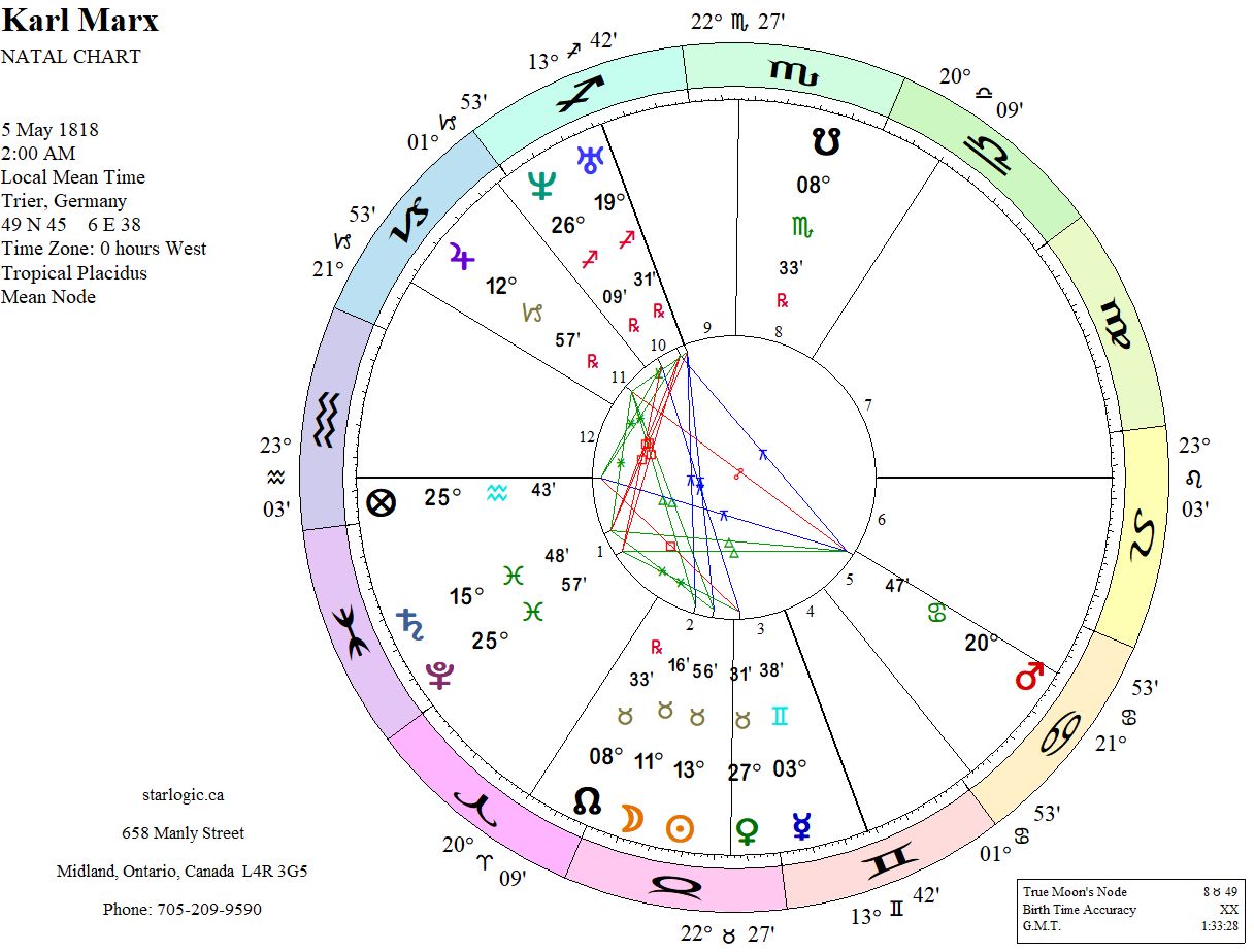 There are five inconjuncts, with two forming a Yod pointing at Mars. This man wanted to start a revolution to free the ordinary man from oppression by an overbearing aristocracy. He eventually inspired the Russians to overthrow the Tsar and their ilk in the 1917 October Revolution. But were his words all that mattered? I would say, no, because the rulers in Russia didn’t do themselves any favours.