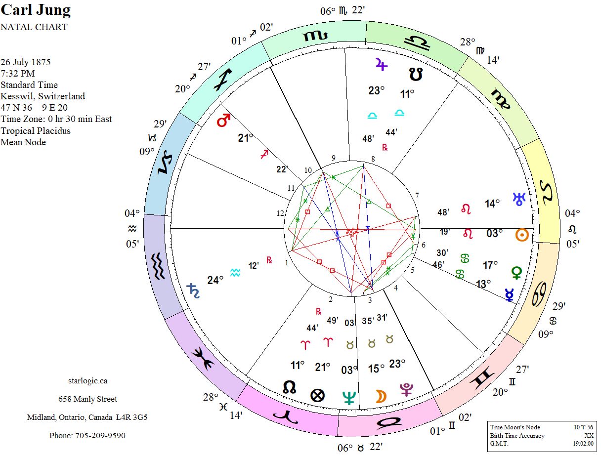 So much of this NDE chart is speculative, the time and the place, for example. But the fact that Neptune is on the Descendant seems fortuitous. It is inconjunct to the transiting Sun, while a Yod is pointing at the transiting Moon, formed by inconjuncts to Jupiter and Saturn. This has all the hallmarks of a spiritual event. But when it is compared to Jung’s birth chart, another insight occurs.