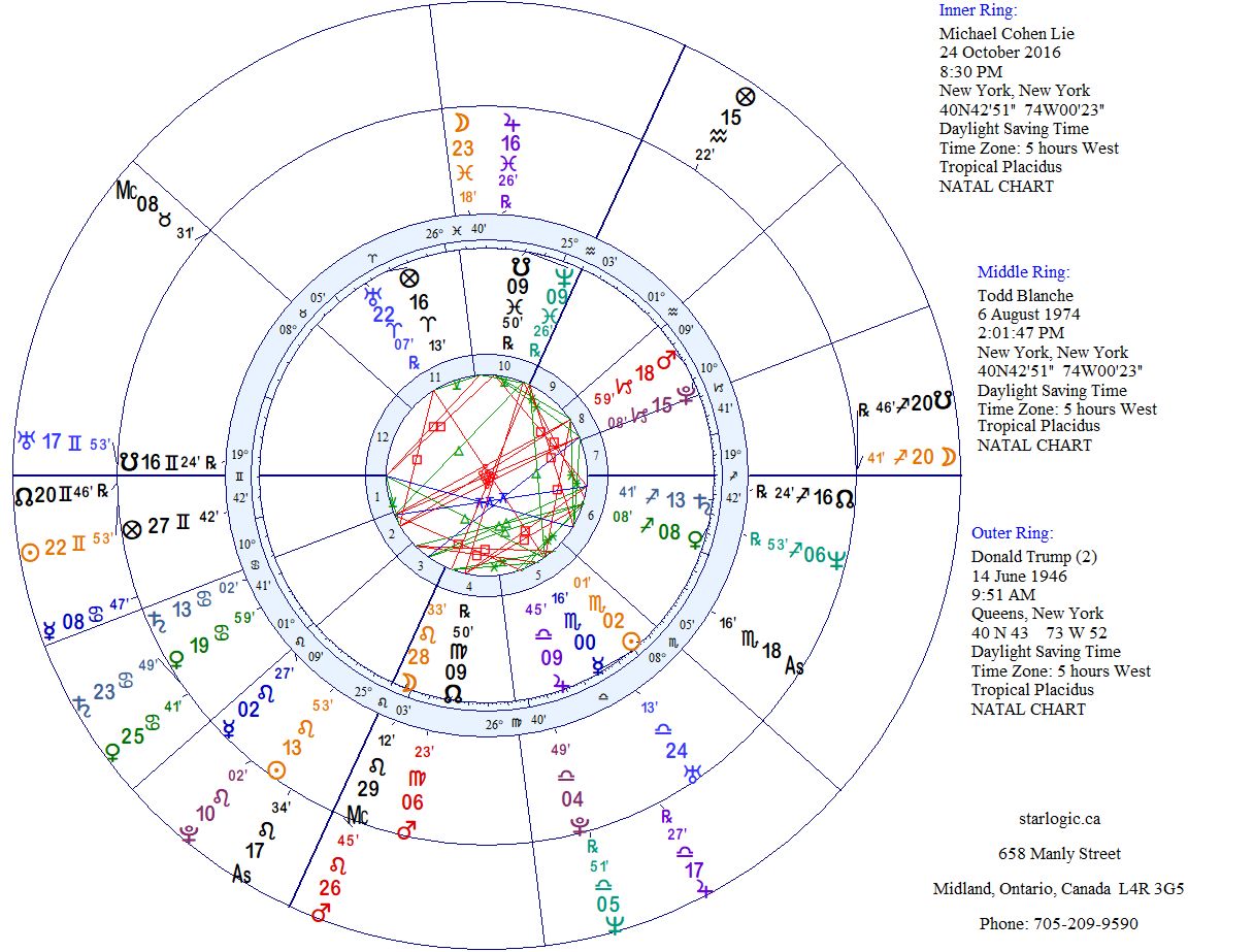 The three charts together shows something unexpected: that “lie” has an Ascendant that is flanked by Blanche’s South Node and Trump’s North Node. These two were connected in a past life!