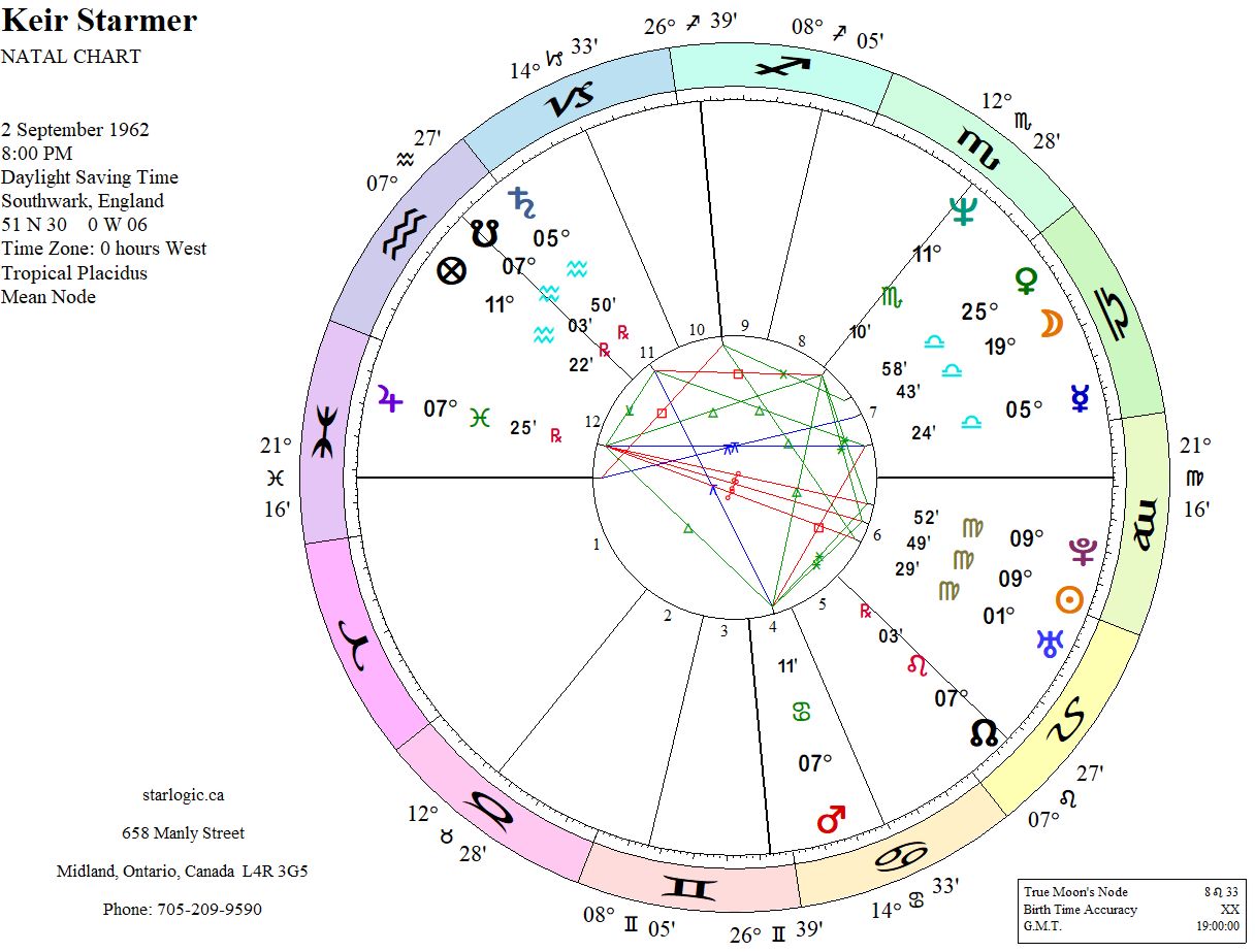 Starmer’s birth time is unknown, so I rectified his birth chart to show Venus @ 45, when he married his wife. Is he really this ‘soft’, with Pisces Rising, Mars in Cancer, Moon in Libra, and Sun in Virgo? I think not. His natal Sun is exactly conjunct his natal Pluto, which gives him an edge of steel. Of the three inconjuncts, shown above, only two can be relied upon: