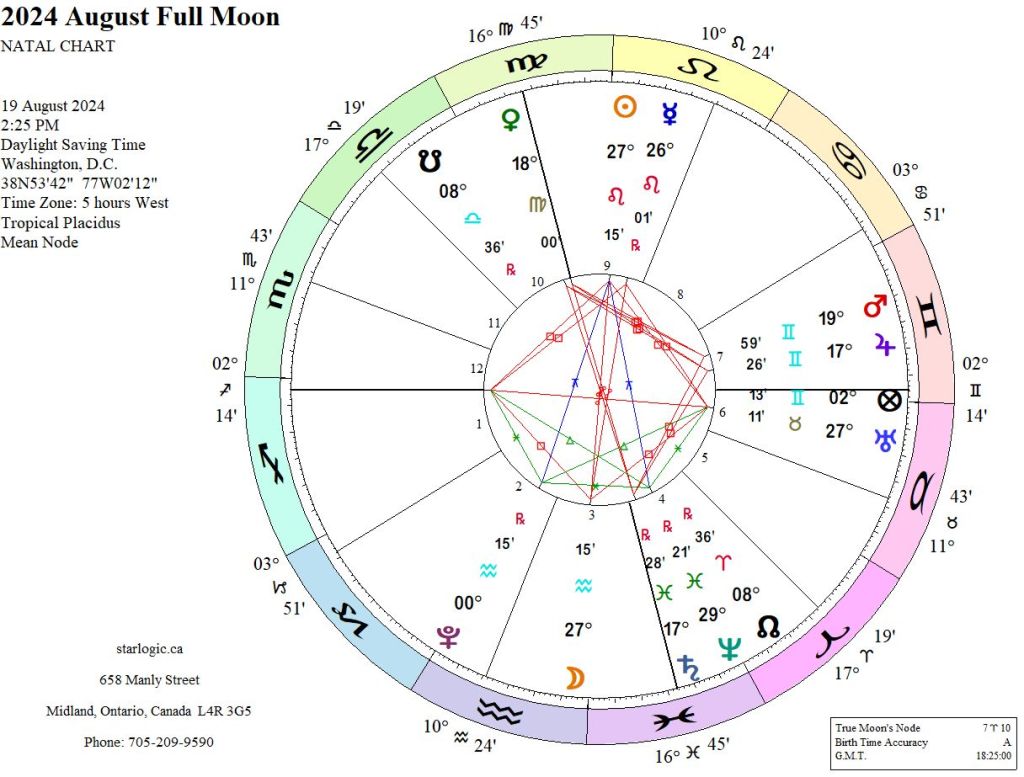 OK. I fell asleep at the wheel with this one: the August Full Moon in Aquarius happens today @ 2:25 pm EDT (based in Washington, DC, for ease of handling). It’s a very dynamic chart, as you can see:
