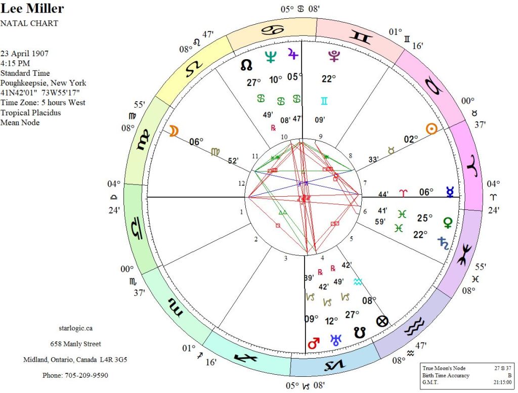 That’s a pretty strong Cosmic Cross in her chart. The Mars/Uranus connection happens between the ages of 4 and 5. Hmm. The position of the Sun at age 40 seems significant, since the war would have been over by then, and her photos from Germany would have become world famous on the pages of Vogue.