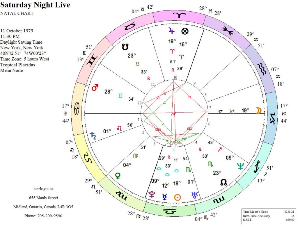 The Cosmic Cross (Sun, Moon, Jupiter, Ascendant) may be the reason it has lasted so long, even though the early episodes weren’t brilliant. And having the Moon in the 7th House (of Open Enemies) may help to explain why John Belushi had an antagonistic relationship with Chevy Chase. Bill Murray ended up replacing Chase in subsequent seasons. (Personally, I never watched Chevy Chase on Saturday Night Live.)