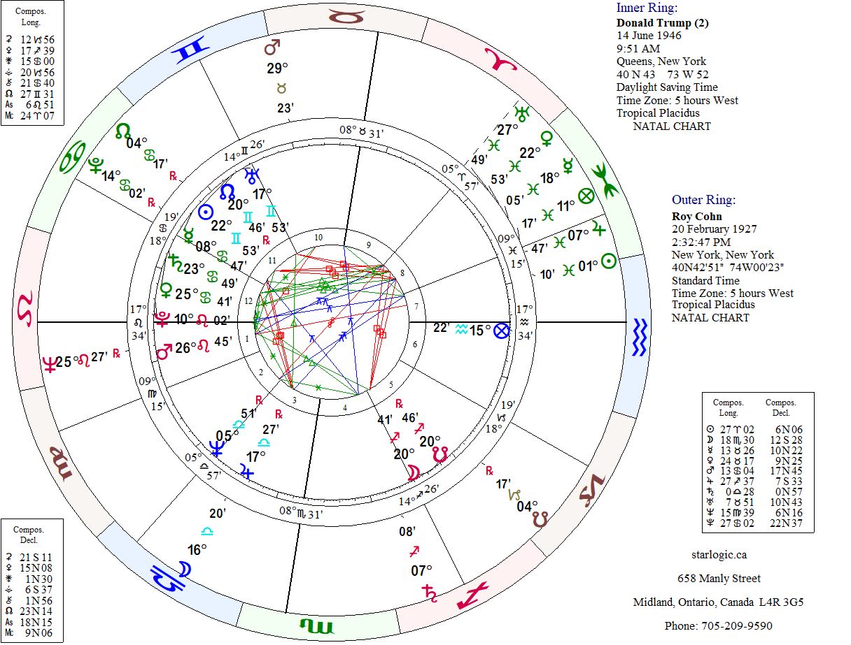 The combined charts of Trump and Cohn show where their energies line up: Trump’s Mercury is conjunct (within 6°) of Cohn’s Pluto; Cohn’s Moon is conjunct Trump’s Jupiter; Trump’s Mars is conjunct Cohn’s Neptune. The interactive Yod, pointing at Cohn’s Jupiter is formed by inconjuncts to Trump’s Neptune and Pluto. There is also a Yod pointing at Cohn’s Saturn, formed by inconjuncts to Trump’s Mercury and Midheaven. These, more or less, prove their relationship to each other.
