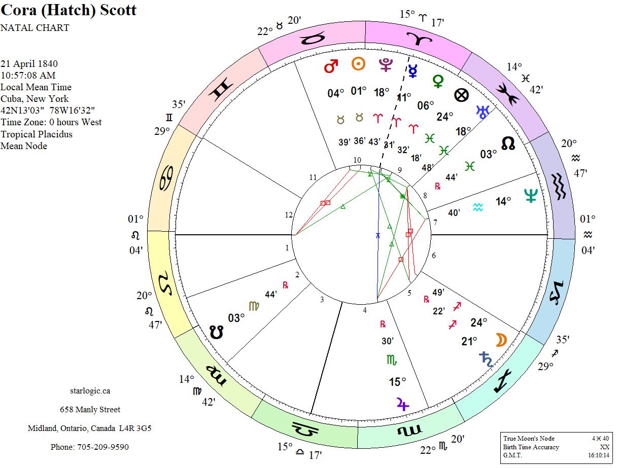 The other placement is Jupiter in the 4th House @ 15° Scorpio 30′ (age 5) This position makes Jupiter inconjunct to the Midheaven.. Evidently, Cora was a child medium who gradually rose to prominence by age 12 or 13. That would relate to the conjunction of Saturn and the Moon in her chart. Hmm.