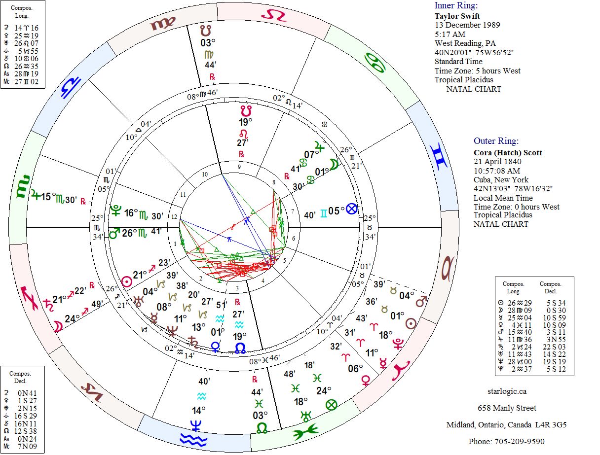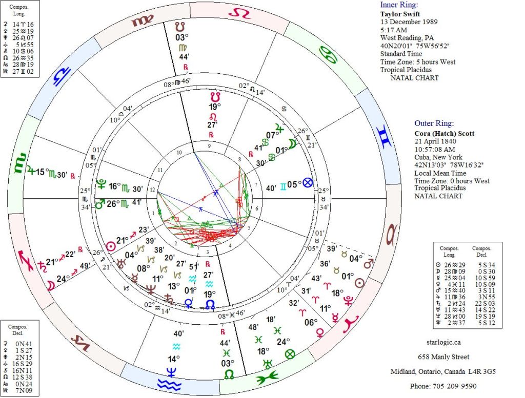 Swift’s Sun is (almost exactly) conjunct Scott’s Saturn (@ 21° Sagittarius 22′). At the same time Swift’s Pluto is exactly 1° from Scott’s Jupiter (@ 15° Scorpio 30′). Finally, Swift’s North Node is within 5° of Scott’s Neptune @ 14° Aquarius 40′). Because these planets in Scott’s chart were highlighted above, I think they are a sign of something significant. What do you think?