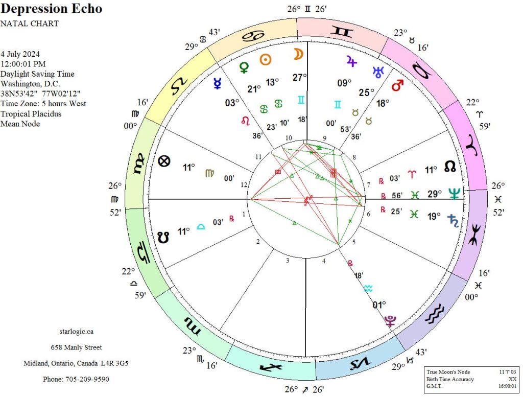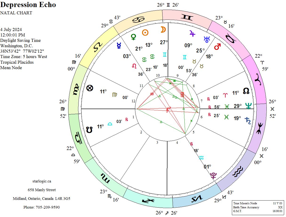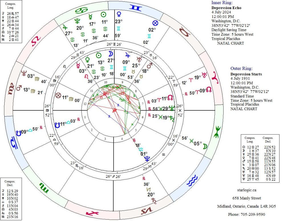 OK. This is where it gets a little freaky. If I hadn’t been shown the 1931 date, we wouldn’t be looking at this situation. The Nodes are repeating their placements in 1931. In fact, the 2024’s Moon is conjunct 1931’s Venus, while 2024’s Venus is conjunct 1931’s Pluto. Meanwhile, 1931’s Neptune is inconjunct 2024’s Pluto, and opposite 1931’s Moon. It’s like a circular argument, just going round and around.