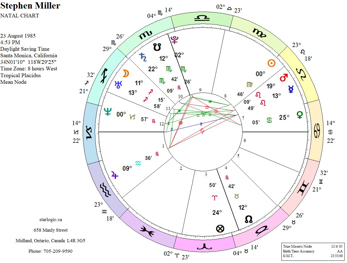 I have avoided looking at this individual because I didn’t want to sully the reputations of the Miller clan. But, now I’m beginning to see that he seems to be the hidden puppet master when it comes to Trump and his policies. (And in a rare moment of insight, it’s a relief that his birth time is known.)