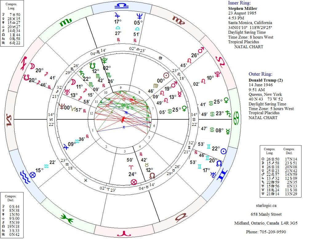 Looking at Miller’s chart with Trump’s, I cannot help but wonder if there’s a bit of a ‘bromance’ here: both charts have Venus @ 25° Cancer. Even their positions of the Moon are within 10° in Sagittarius. And, Miller’s Pluto is within 4° of Trump’s Mercury and 10° of Trump’s Mars, which is within 8° of Miller’s Mars. It goes without saying that their thinking runs along similar trains of thought.