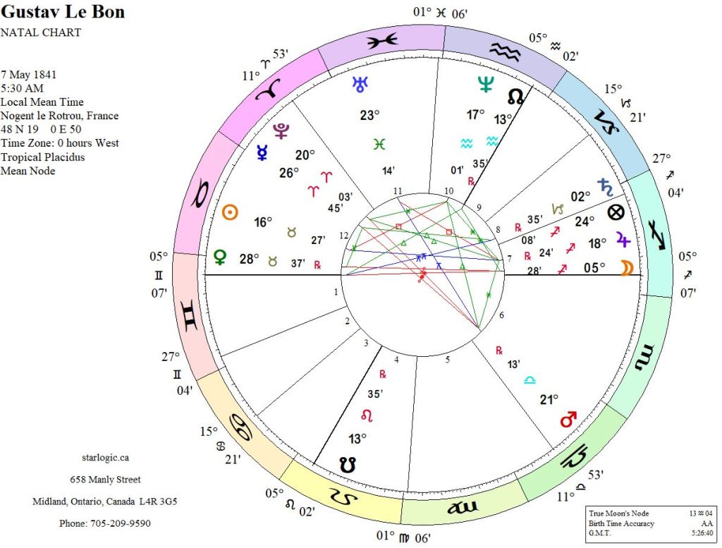 Gustav Le Bon is featured in this video, too. Surprisingly, I had never heard of him before, but his background sounds familiar. It made me wonder what his birth chart would reveal.
