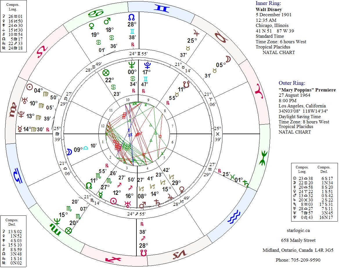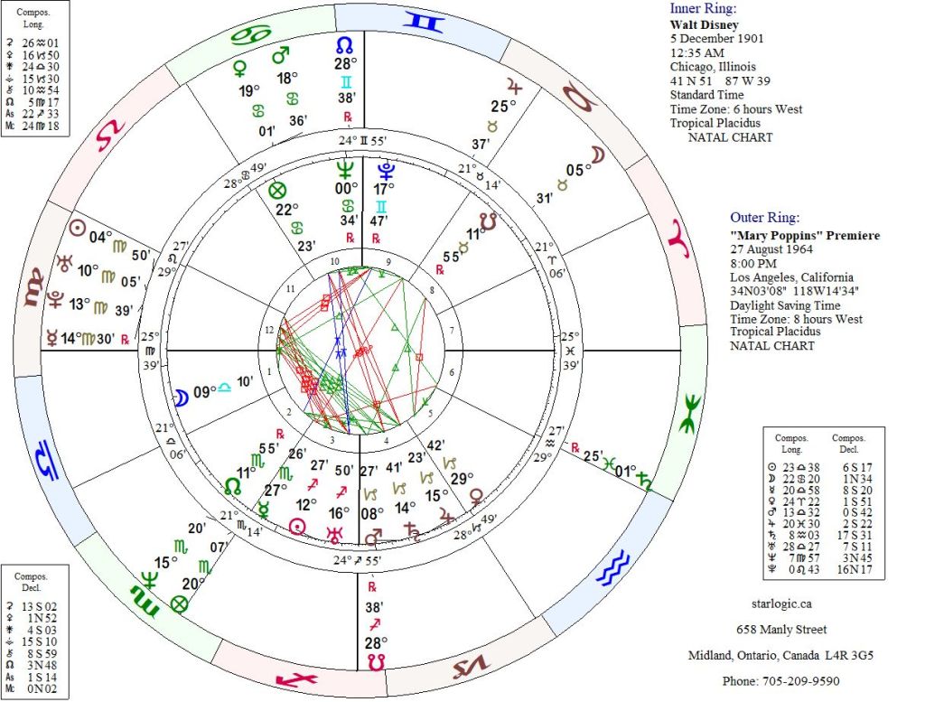 So, is there anything here that can explain why “Mary Poppins” would be an instant hit and have sixty years of popularity and influence? Sun in Virgo opposite Saturn in Pisces, perhaps? There is only one inconjunct, linking Jupiter and the Midheaven. This would probably relate to the struggle for control over the whole project between Walt Disney and P.L. Travers, the author.