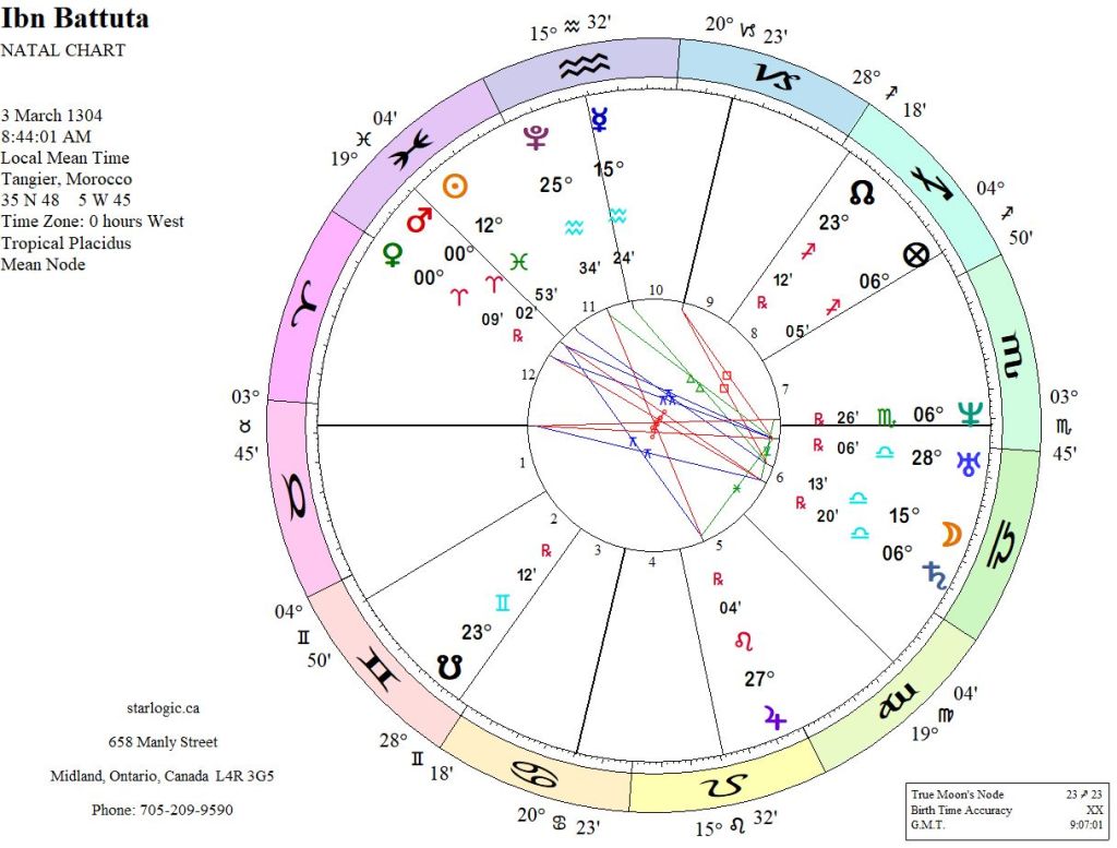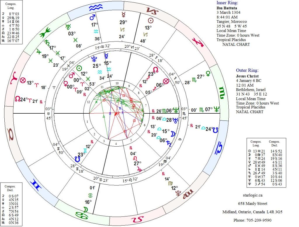 Their Neptune placements are closely conjunct. Is that enough? Perhaps not. But what it shows me is that both men were itinerates, constantly on the road and preaching the Gospel (Good News). Battuta’s Sun is opposite Jesus’ Pluto. Could this imply the moving on to a different phase, Jewish to Muslim?