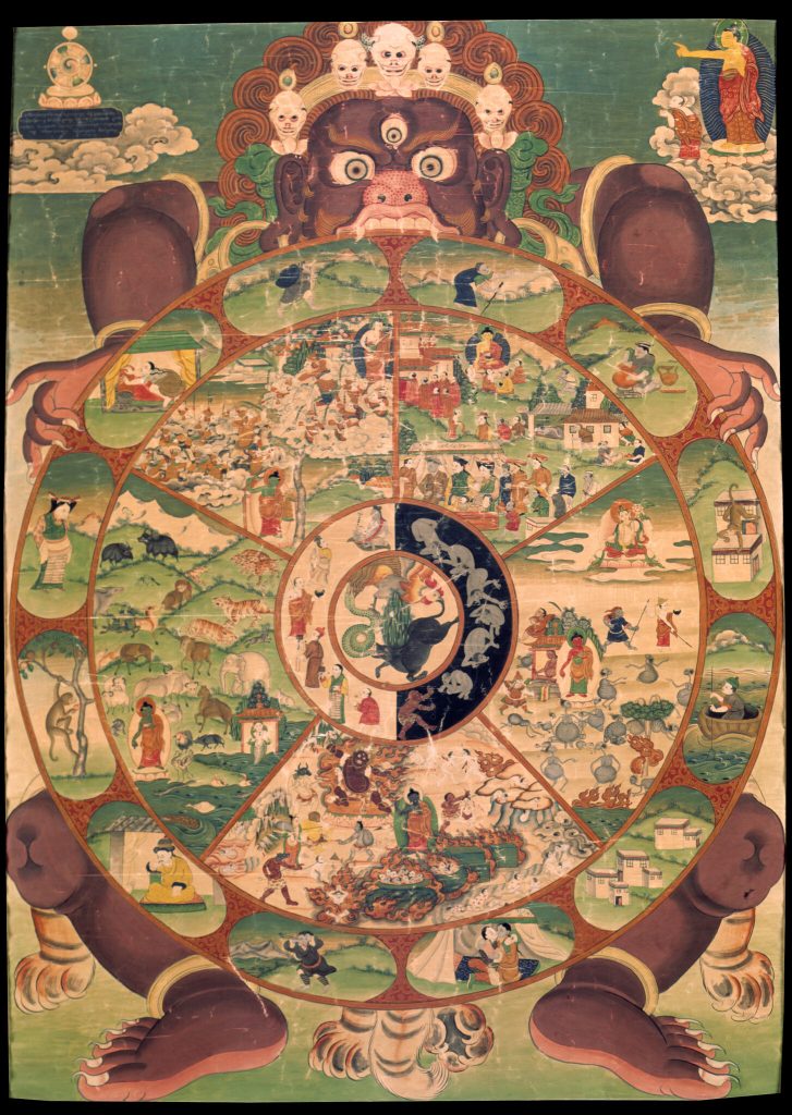 The wheel is held by Yama, the Lord of Death, who symbolizes impermanence and the inevitability of death. The snake that surrounds the wheel represents the cycle of birth and death, while the moon and sun in the background represent the duality of existence.