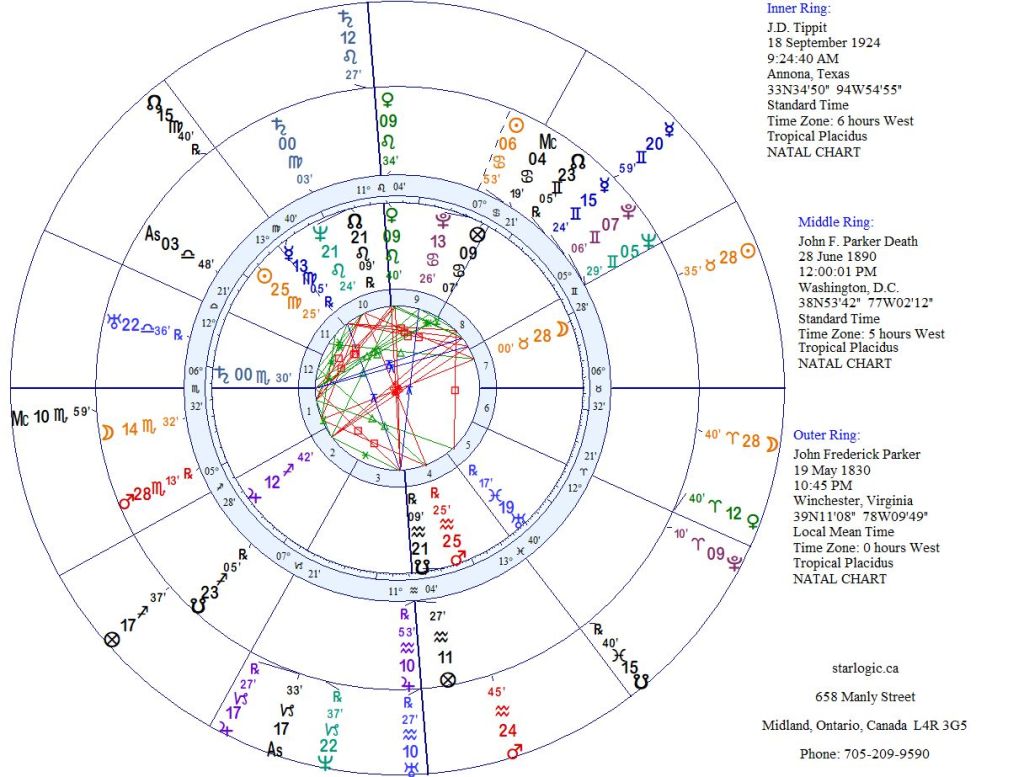 Parker’s natal Sun conjunct Tippit’s natal Moon is the aspect that convinced me, plus the ‘fatal’ Venus being conjunct Tippit’s natal Venus, and Parker’s natal Mars being conjunct Tippit’s natal Mars.
