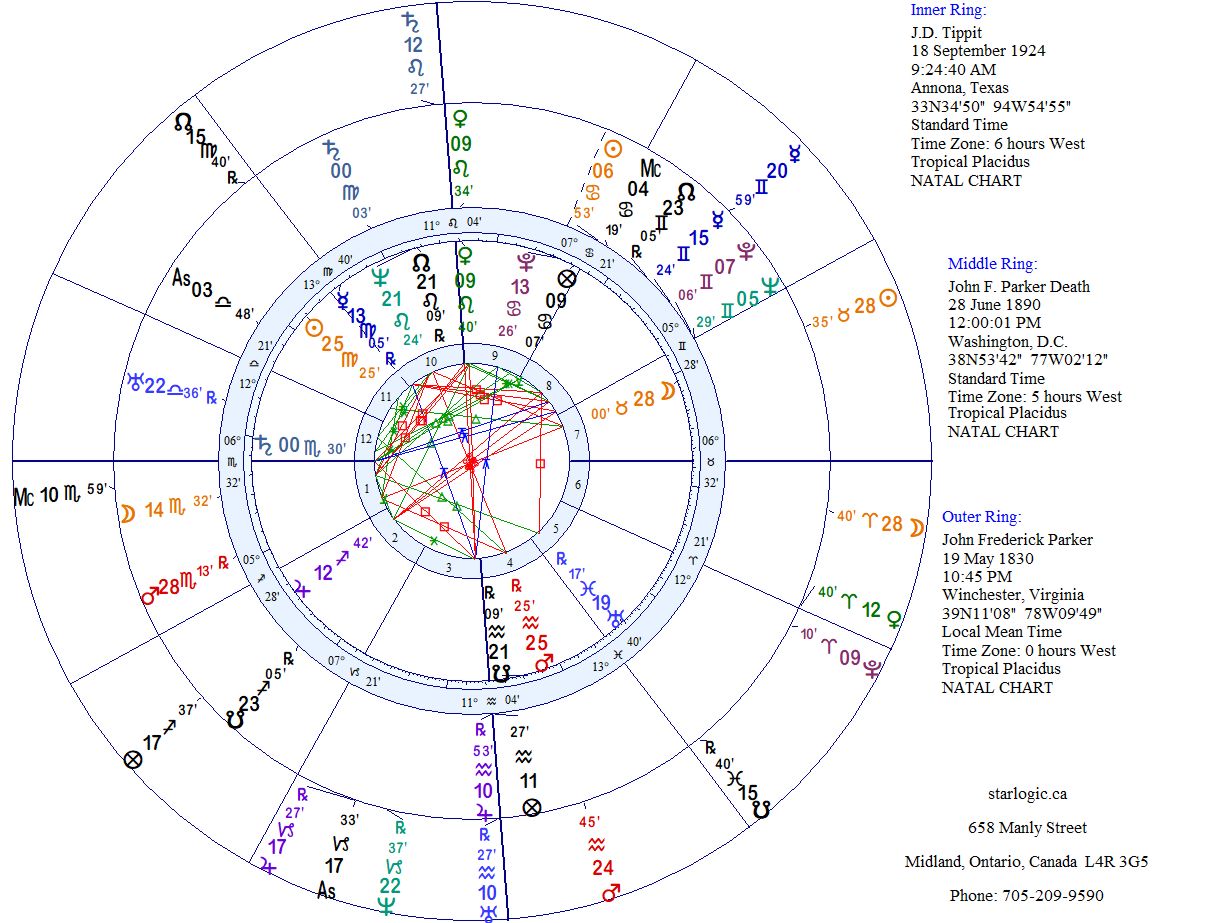 Parker’s natal Sun conjunct Tippit’s natal Moon is the aspect that convinced me, plus the ‘fatal’ Venus being conjunct Tippit’s natal Venus, and Parker’s natal Mars being conjunct Tippit’s natal Mars.