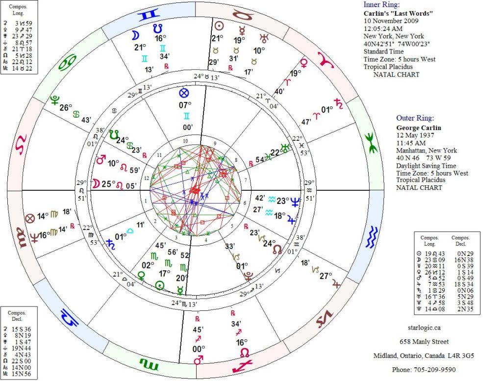 The strongest line-ups between these two charts connect to the Last Words’ North and South Nodes: they align to Carlin’s natal Jupiter/Pluto opposition. That totally makes sense, at least to me. He had some final thoughts that he wanted to share with the world, and as always they would be dynamic.