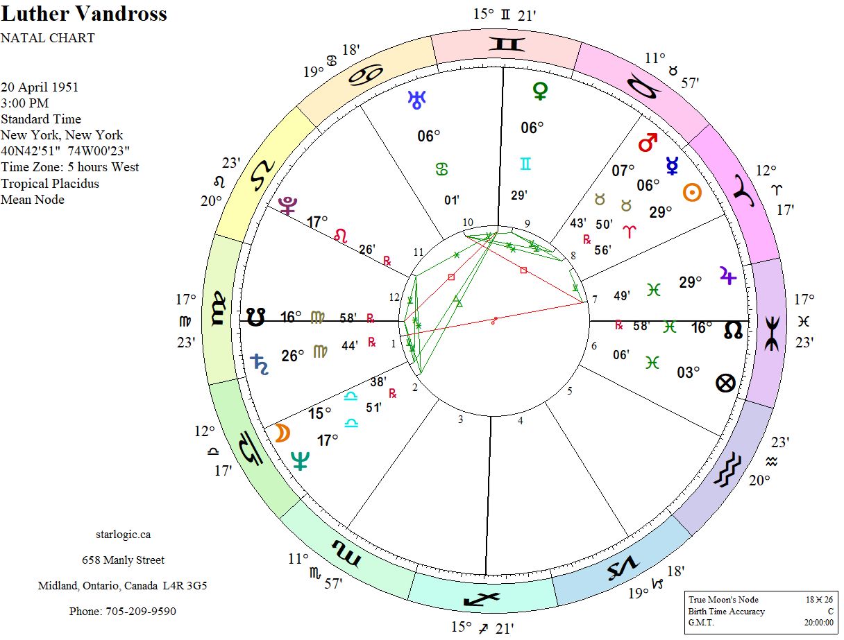 Guess what: no one knows what time he was born, so his birth chart is going to be a bit iffy. In order to recognize his first #1 hit at age 30, I have set the clock at 3 pm, so that Jupiter is highlighted for that age.