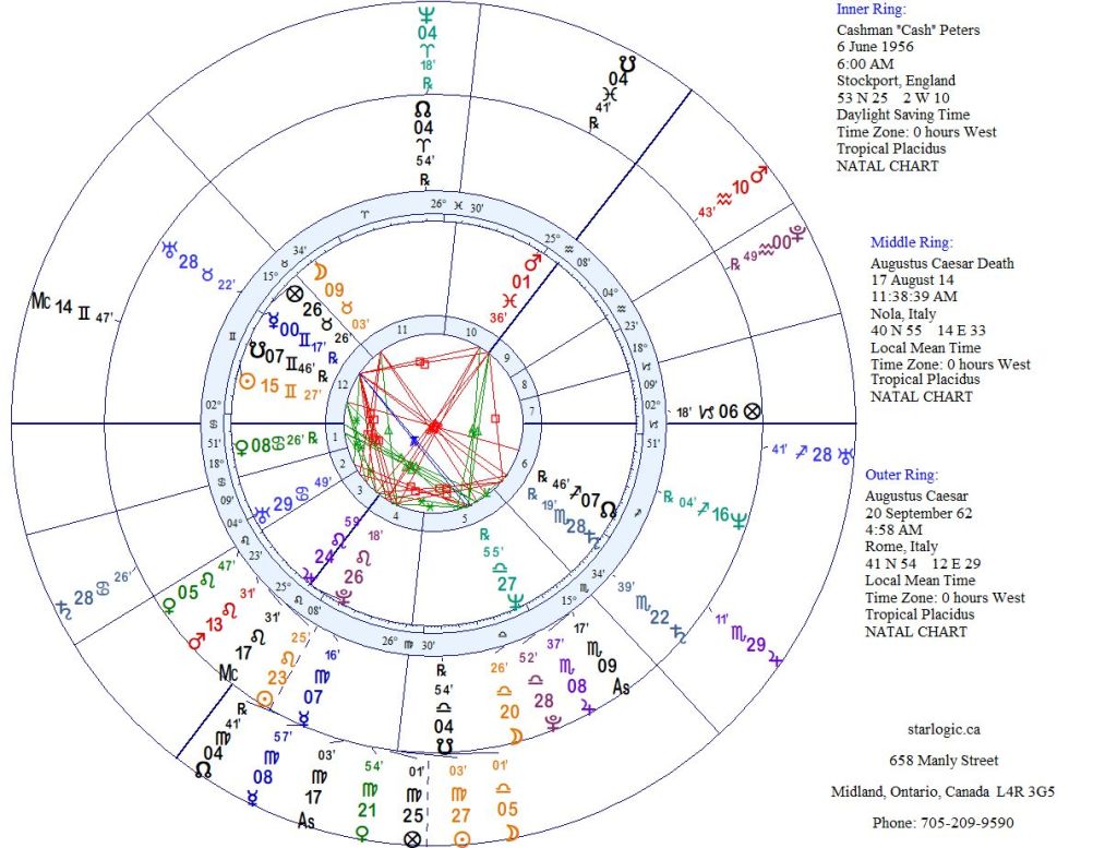 Focusing on Cash’s birth chart and Augustus’ death chart, there are a number of connections, there, too: Cash’s Neptune is conjunct Augustus’ ‘fatal’ Pluto; while Cash’s Pluto is within 3° of Augustus’ ‘fatal’ Sun. Finally, Cash’s Part of Fortune is within 2° of Augustus’ ‘fatal’ Uranus. Is it enough?