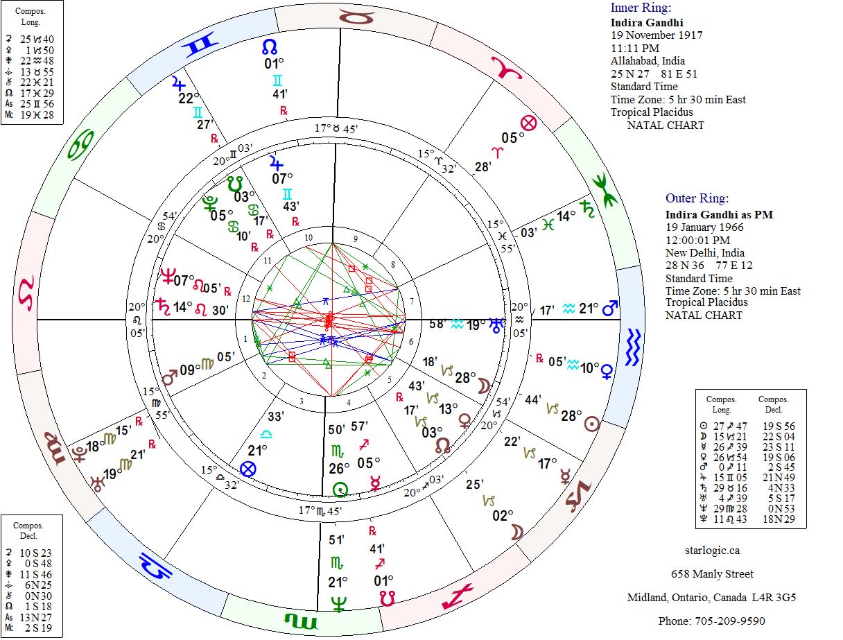 When the day came for Indira to assume the mantel of government, the event Sun was transiting her natal Moon. That has to be significant, does it not? The event Moon, meantime, was transiting her natal North Node. The event’s South Node was midway between her natal Sun/Mercury conjunction, and the event Mars was opposite her natal Leo Ascendant. It’s all very auspicious. Her time had definitely come.
