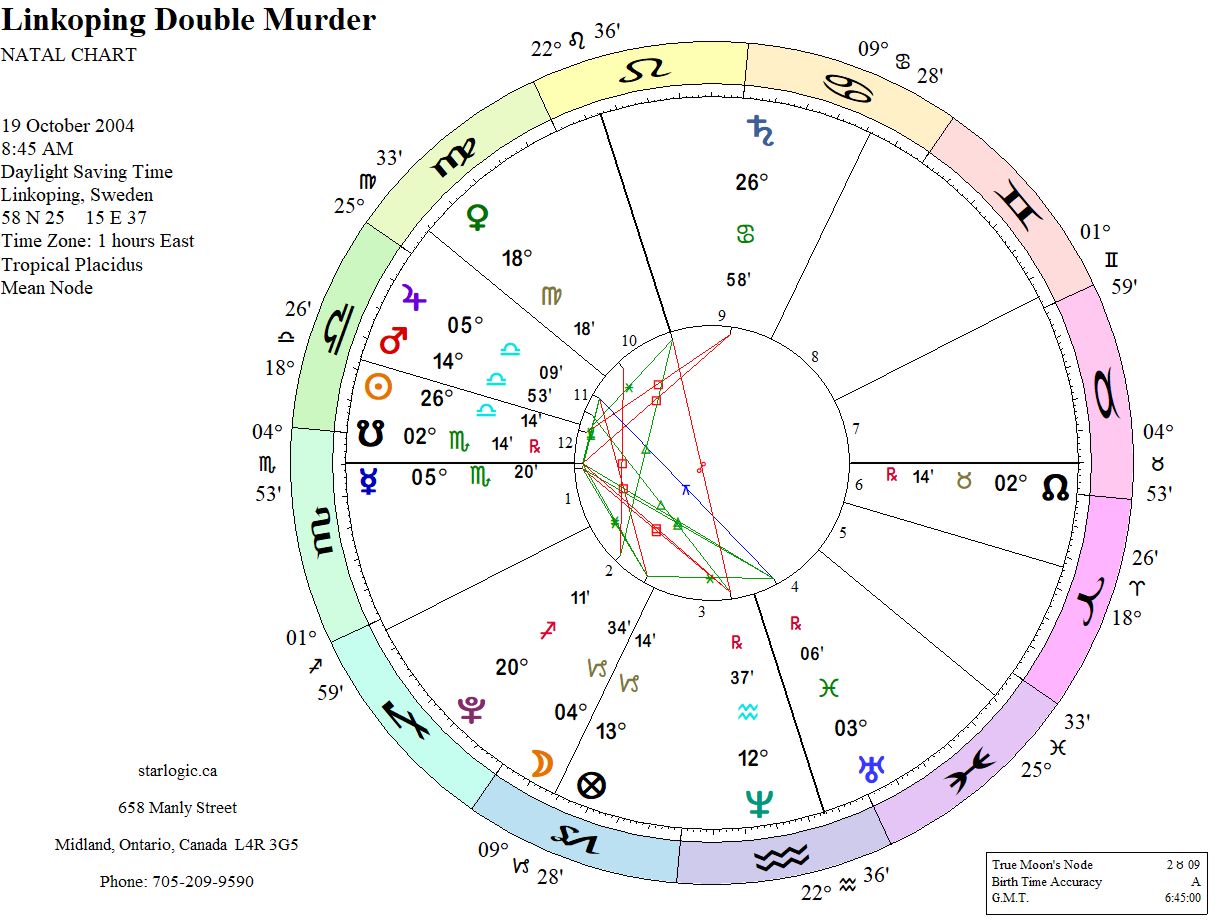 This is the chart for the double murder. Scorpio Ascendant conjunct the South Node and Mercury tells the tale. Neptune in opposition to the Midheaven tells the rest of the story. There is one inconjunct: