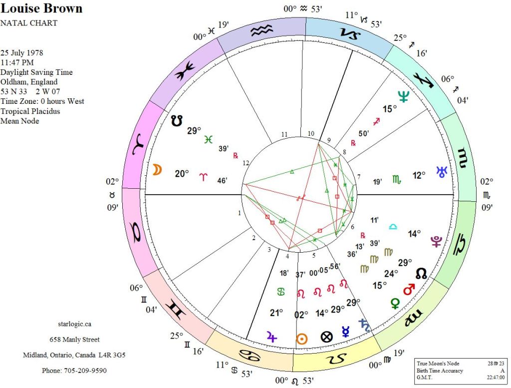 Note that there are NO inconjuncts. What you see is what you get, folks. Mercury and Saturn are closely conjunct and that may represent the birth of in vitro fertilization, itself.