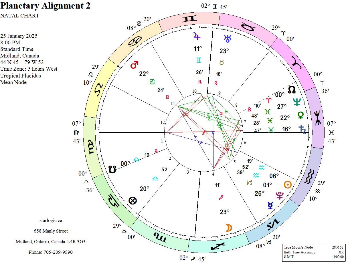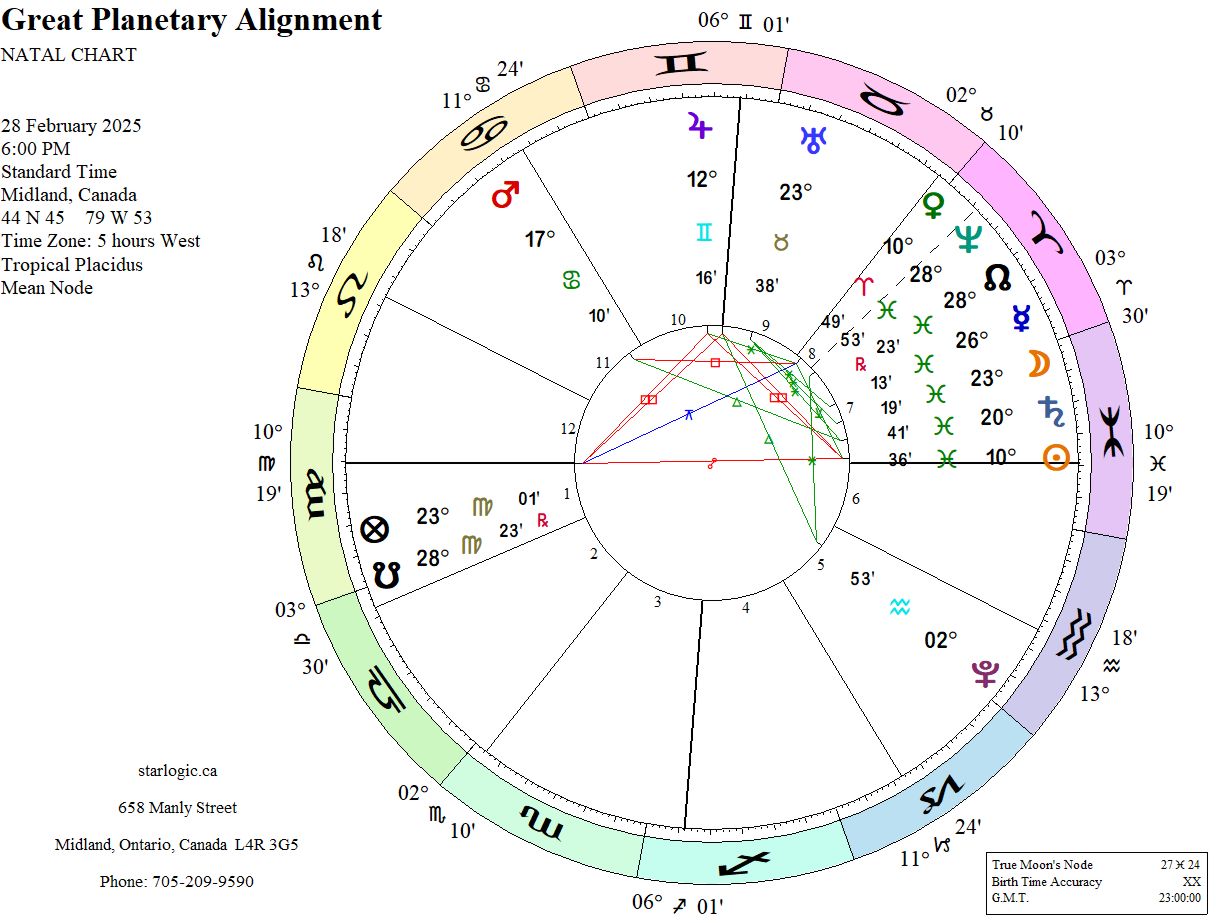I set the clock for 6 pm, when the Sun would be setting in the western sky. Notice how, in more than a month, Venus has moved on to almost 11° Aries, leaving Mercury, Saturn and Neptune behind in Pisces. Because the Sun and the Moon are also in Pisces, this becomes an interesting line-up of energies, all in the 7th House (of Open Enemies and Relationships). Hmm.