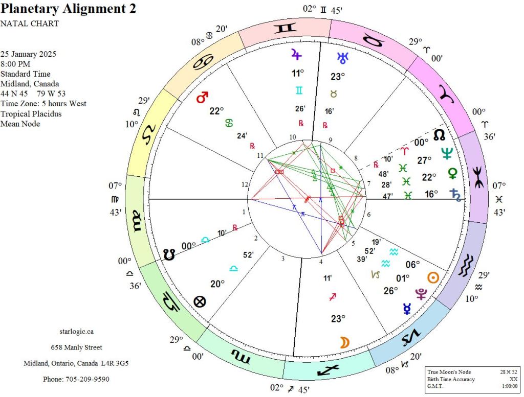 Interestingly, there are three inconjuncts, two of which form a Yod pointing at the Moon (which was not visible at the time of viewing). If the Moon had been visible, it is doubtful that any of the planets would have been visible at all.