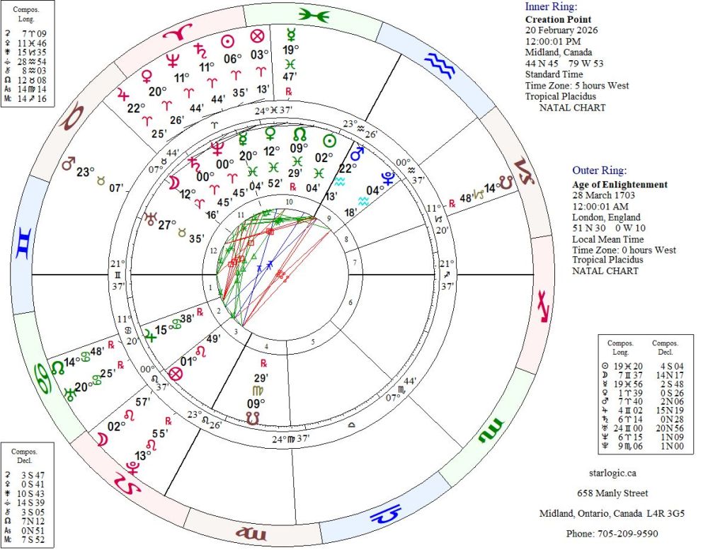 Well, I know it’s an astrologer’s job to warn of upcoming events but sometimes turning that into click-bait cheapens it, at least for me. Evidently, the last time Saturn and Neptune were exactly conjunct in Aries (this time @ 11°) the date was March 17, 1703 (O.S.) in the middle of the Age of Enlightenment.