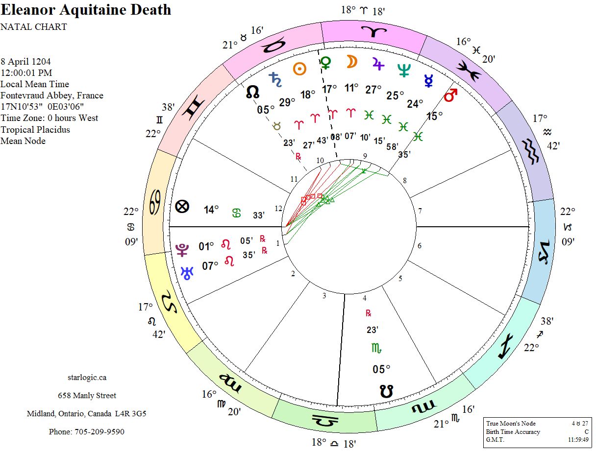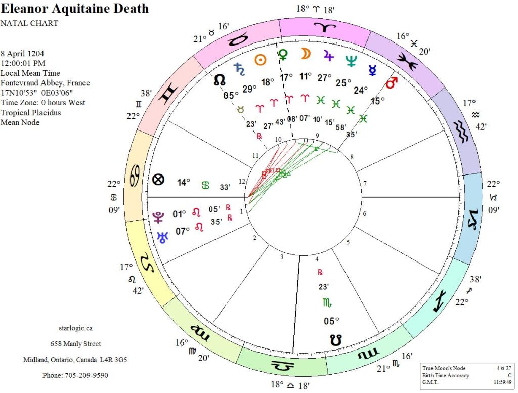 There is some ambiguity about the date of her death: some say March 31st, some April 1st. I settled on the one that Wikipedia suggests. The time of day is unknown, which is surprising as most royalty’s precise details are known and recorded in history. I suppose the vagueness comes from her dying in a monastery. The noon timing brings a Royal Train, starting at Mars in Pisces and continuing through to Saturn in Aries. Only Uranus and Pluto are separate and conjunct in Leo. She died the way she lived: fully and completely a monarch.