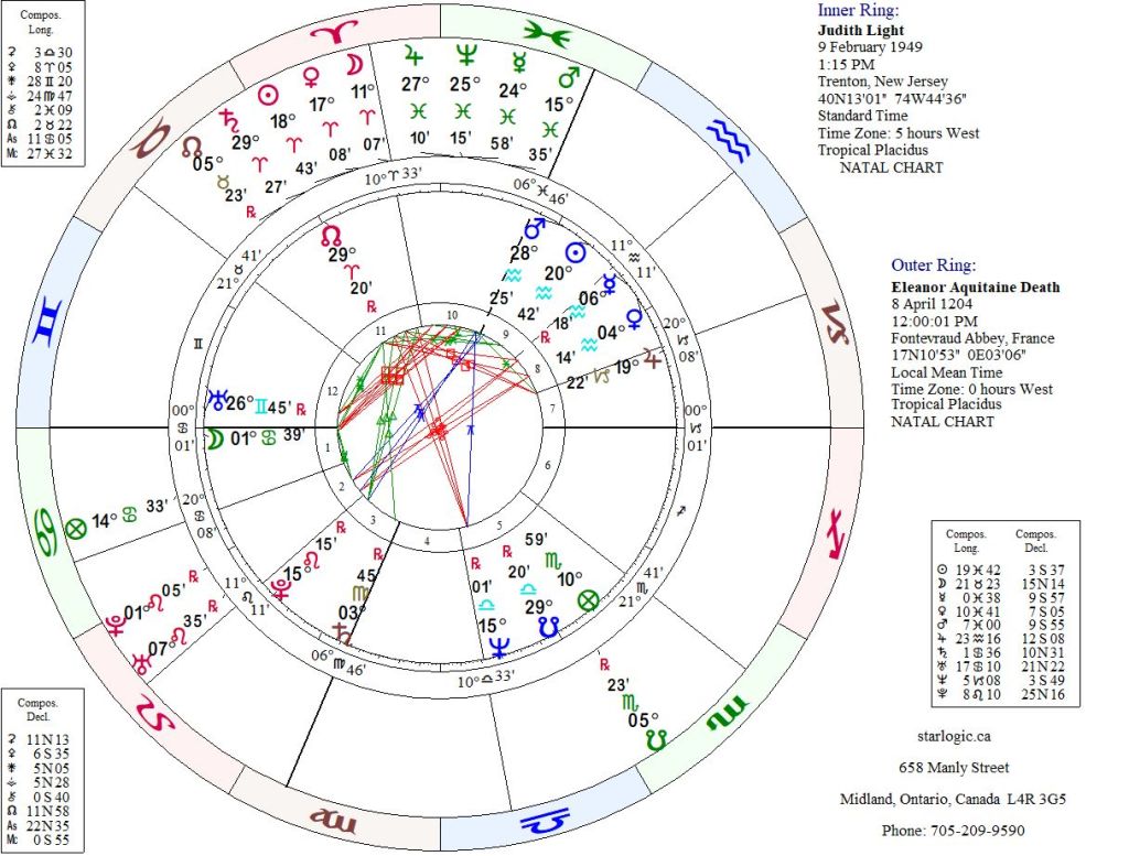 Eleanor’s ‘fatal’ Saturn is (almost) exactly conjunct Judith’s North Node. And the North/South Node axis between them is within 6°. The interactive Yod from Judith’s Neptune and Pluto is pointing at Eleanor’s ‘fatal’ Mars. That fighting spirit never died, it just moved forward in time to a 20th century actress.
