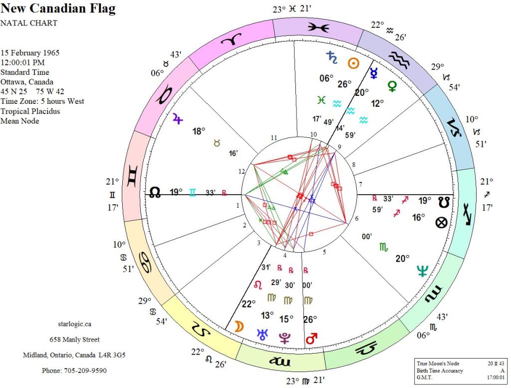 Hmm. Gemini Ascendant conjunct the North Node. Obviously significant for a country of two nations (English and French: First Nations weren’t taken into account then). The Cosmic Cross with oppositions involving most of the planets is significant, too (hence the hoo-ha over the flag’s adoption). The energetic undercurrent is expressed by the four inconjuncts.