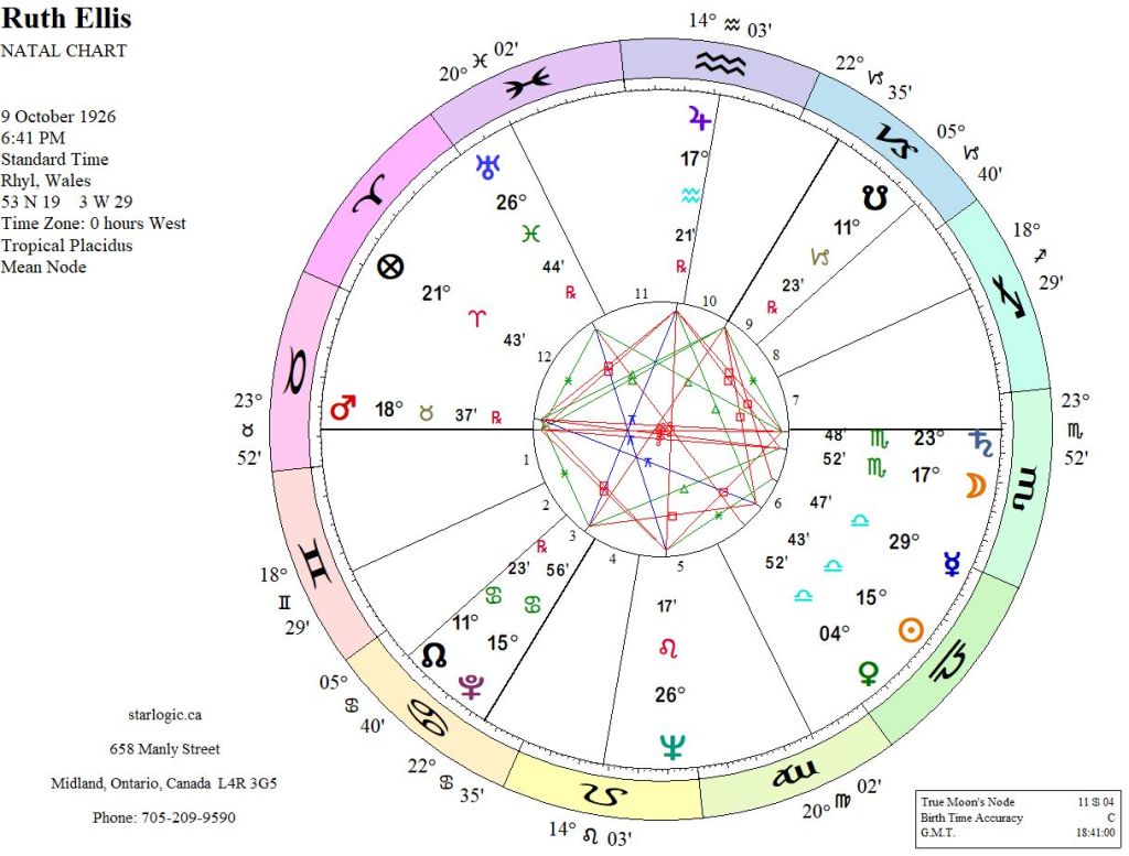 I suspect this birth time was chosen because it demonstrates the unconscious anger issues Ruth may have had. Mars in the 12th House, conjunct a Taurus Ascendant would be a sign of mental illness, especially when it is opposite the Moon and Saturn conjunct. Her parents set the pattern of conflict in her life, and the result brought her to that fateful day.