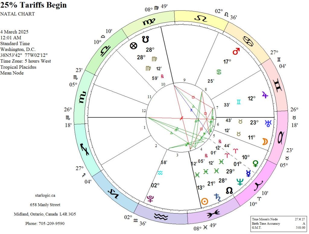 There is but one inconjunct, the rest are mainly sextiles and trines, with three squares and one opposition. Two of those squares form a T-square pointing at Jupiter, along with that opposition between the Sun and the Midheaven. The inconjunct explains the underlying reasons for Trump’s actions.
