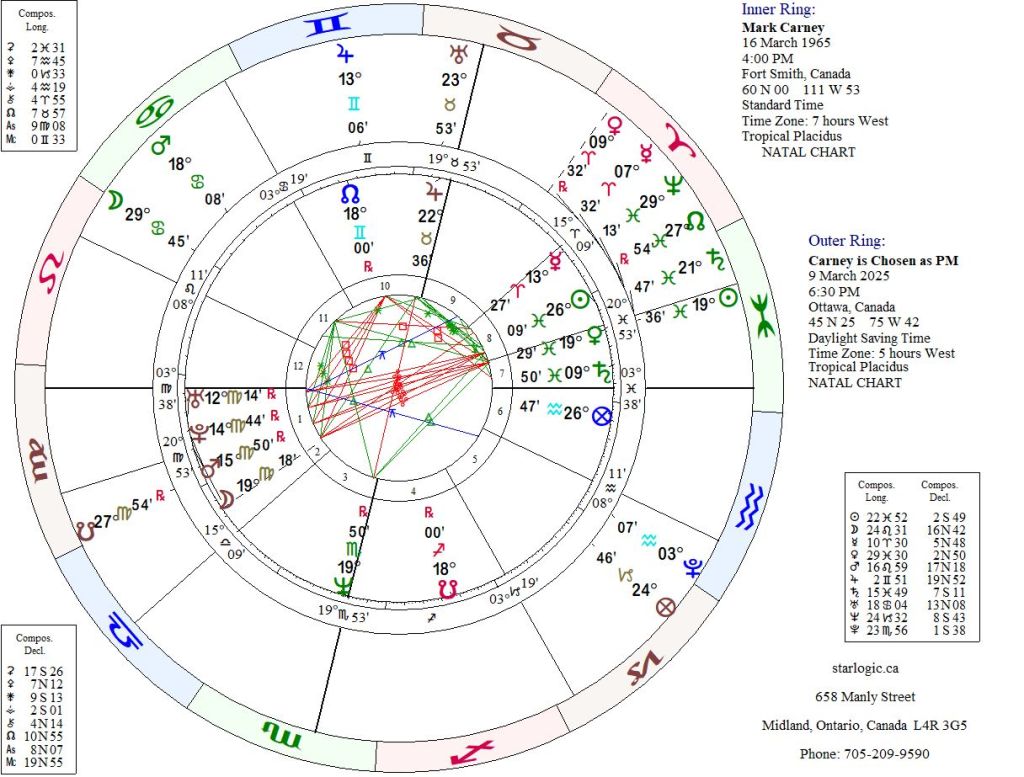 This is an interesting chart: the Sun and Saturn are conjunct the Descendant, as it was just before sunset; the Moon is opposite Pluto; and Mercury and Venus are conjunct in Aries. This is the start of a new era.