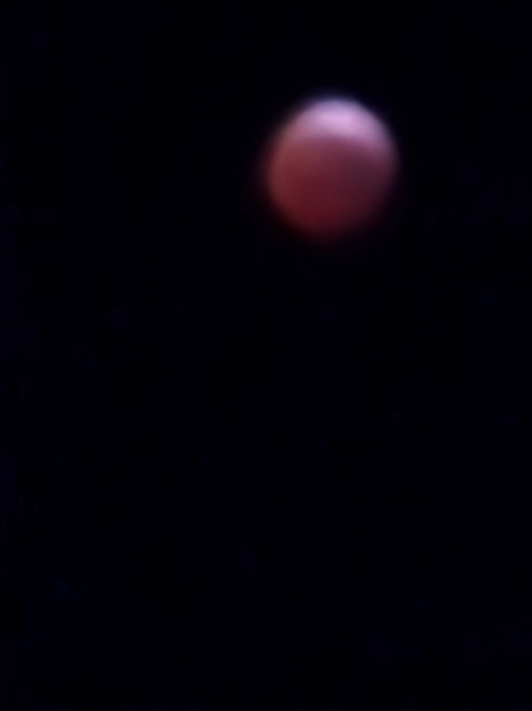 It’s a funny thing to do: I got up at 2:45 this morning to see the eclipse. Our Chihuahua, Buddy, ever on the alert, started barking when I opened the back door to view the moon’s position in the night sky. My phone camera couldn’t catch the image clearly, which was a disappointment to me personally. Here it is: