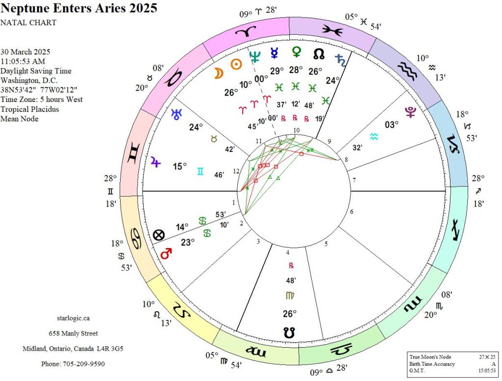 Notice how the position of Neptune is 3′ from its transit into Aries. We’re nearly there, as I’m writing this, today, on the 29th of March, 2025. The exact transit is tomorrow at approximately 11 am.
