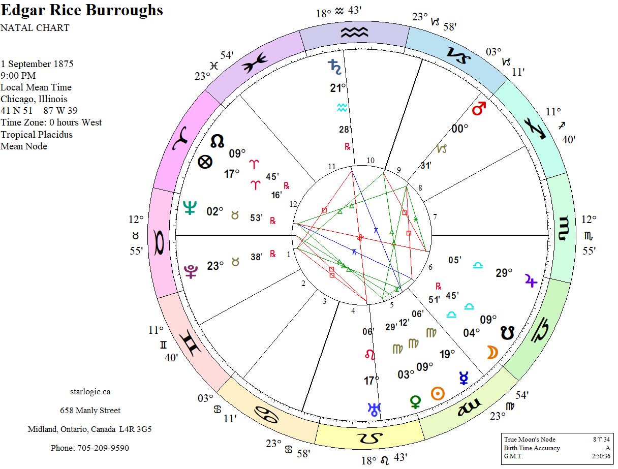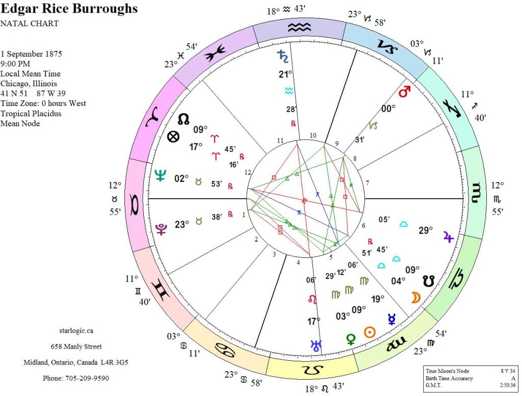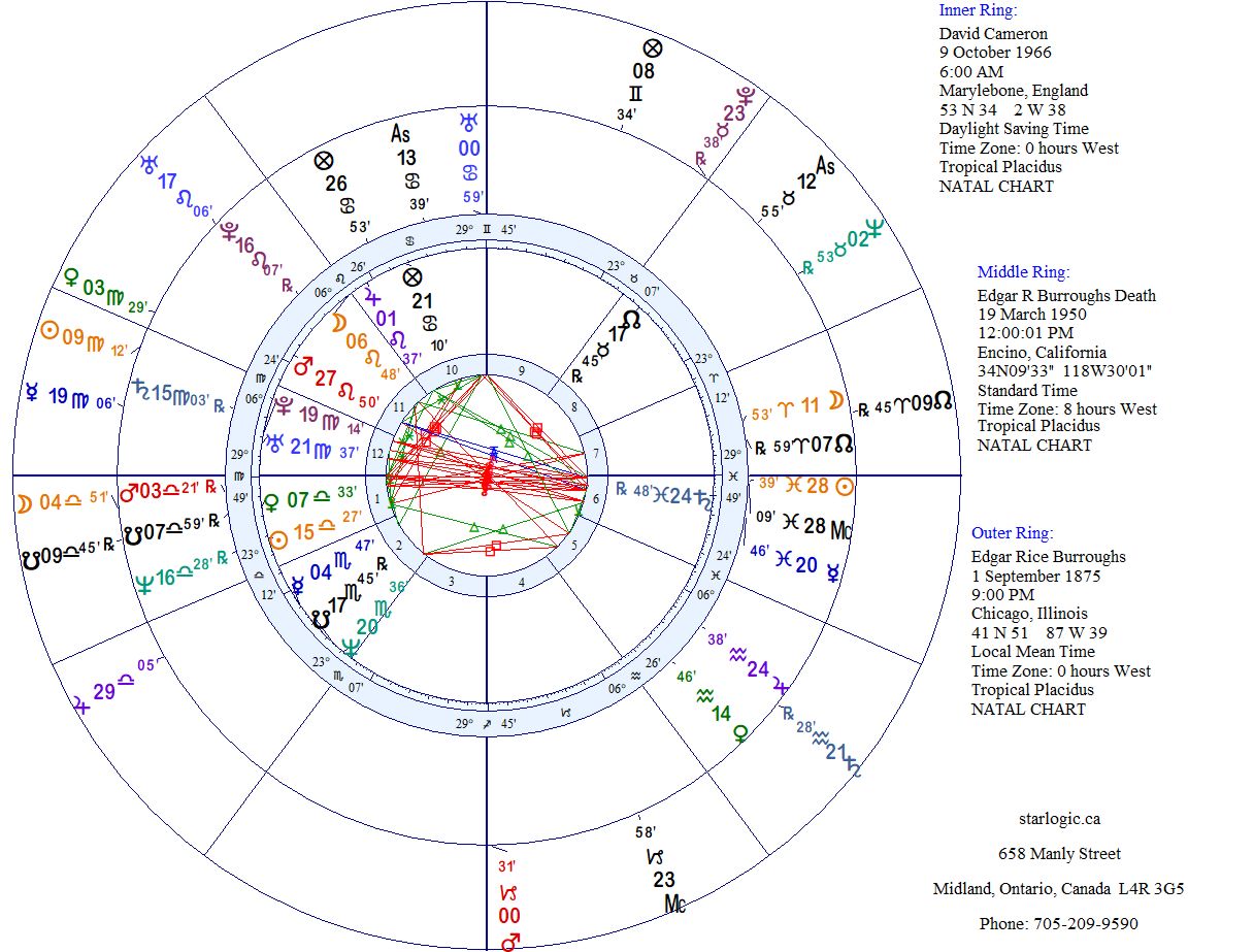 Because I had already aligned David Cameron with George IV, it should come as no surprise that an intervening life as Edgar Rice Burroughs is quite possible, if only probable. The comparison of Burroughs’ birth and death charts with Cameron’s birth chart, does point to a link involving Burroughs’ South Node(s).