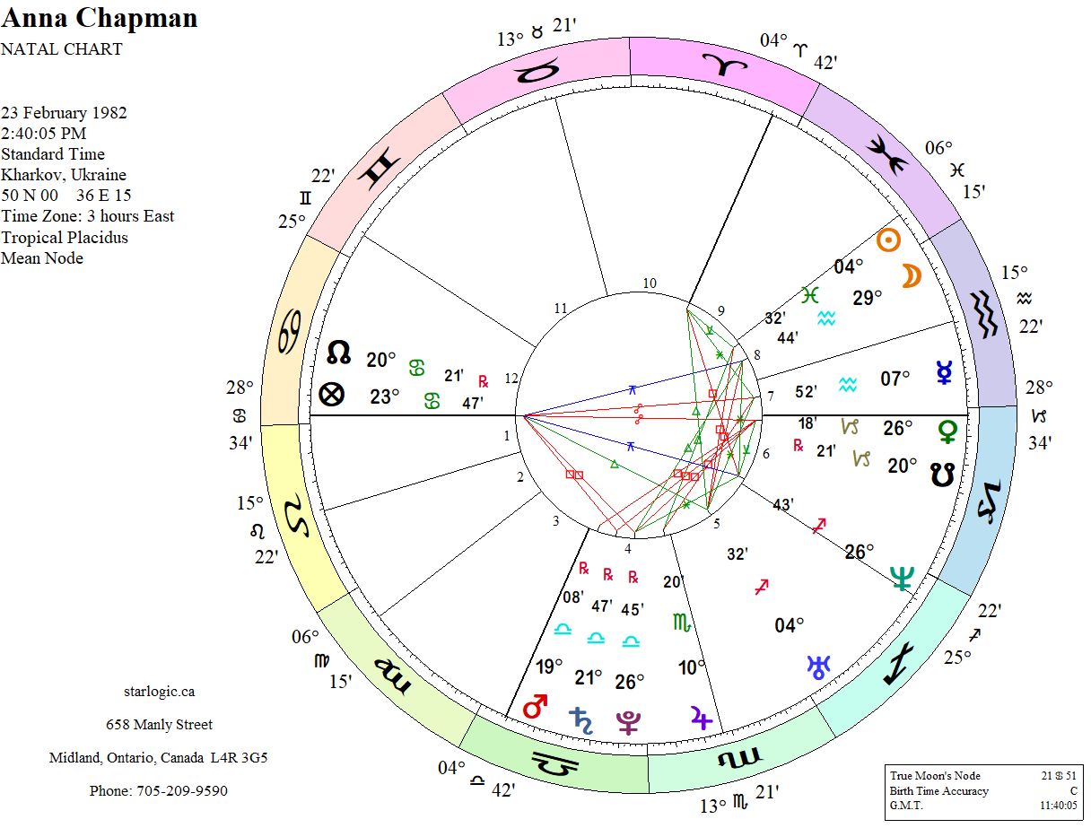 This young woman in my dream was willing to let me witness her recruitment methods, and her recruits seemed quite willing to spy for her, even though they knew she had links to Russia, Some of their close friends even applauded her efforts. This is unusual in my experience. So I thought I should look at her birth chart (for which the time of birth is unknown), knowing that Neptune and the Ascendant would be connected, somehow. The Neptune/Ascendant aspects seem to highlight an actress’ state of mind.
