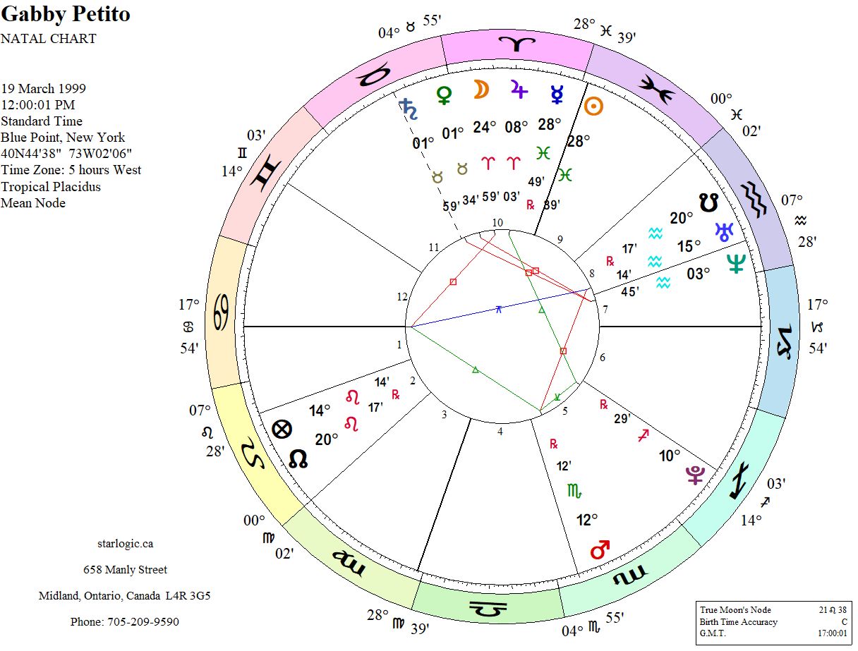 Hindsight is only available after the fact, but the signs were there that something awful was going to happen to her, at the hands of her boyfriend. There is no definitive date of death, so the moment of her demise cannot be accurately charted. Even her birth chart is shrouded in mystery, since there is no birth time known. In fact, of the two sites that show a birth chart for her, give her a dawn birth. I was originally going to randomize the timing, but then a thought occurred to me: why not use noon, instead?