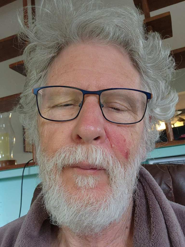 The illustration is for entertainment purposes only. My face actually hit the side table again, this time on the left cheek, leaving scrapped skin. My knees and right elbow hit the floor hard. My large right toe had the skin pulled back, by the bed frame, most likely.