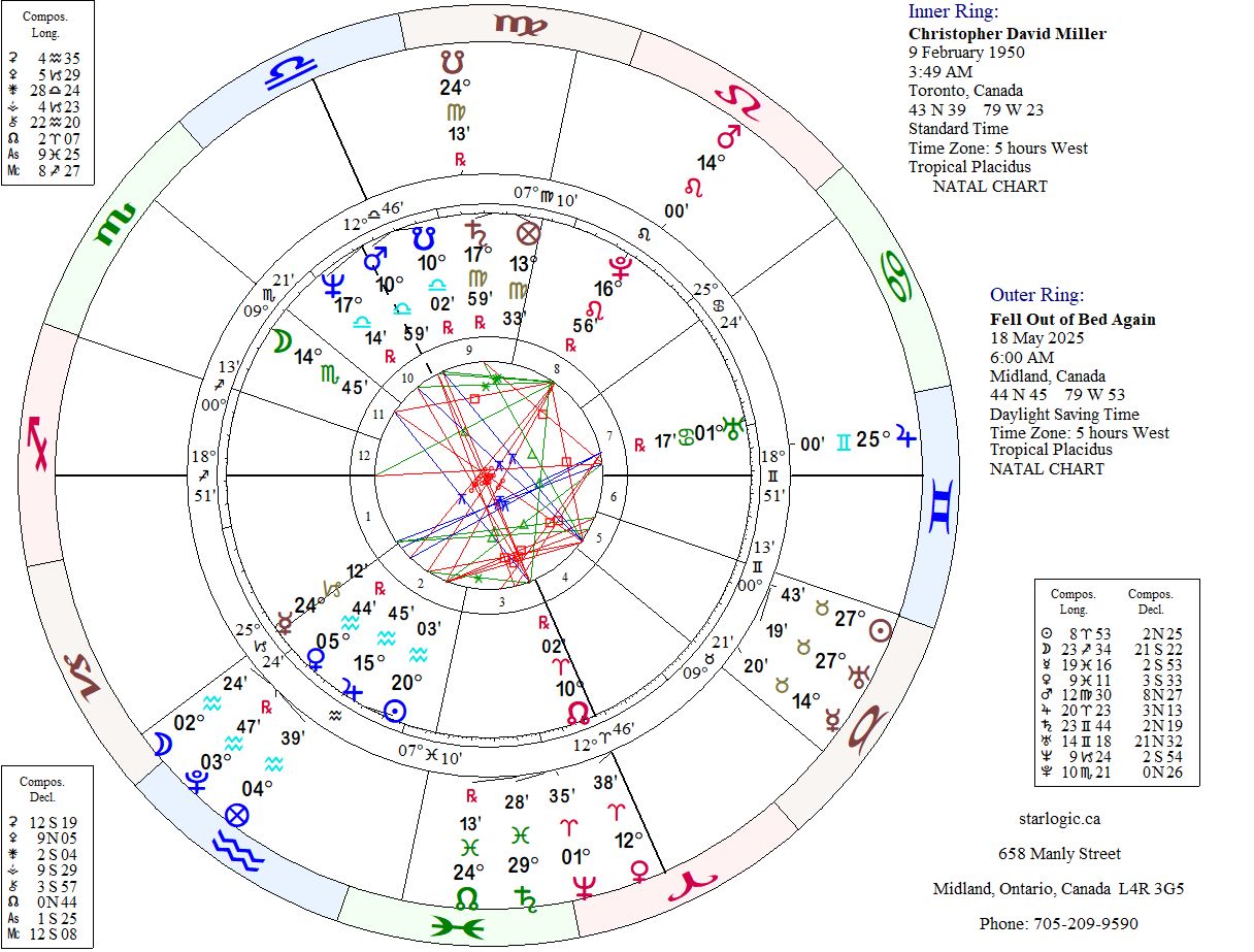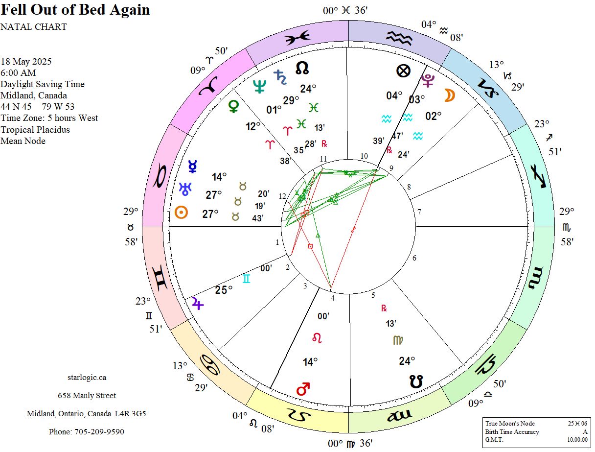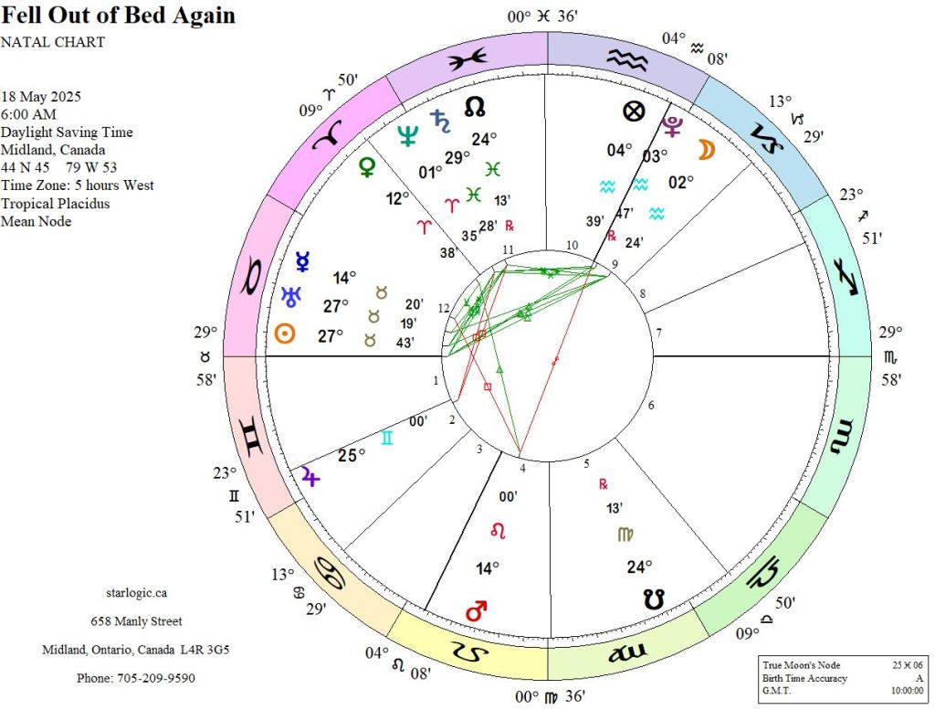 Well, it’s close. However, Mars is now in opposition to the Midheaven, which is conjunct to the Moon and to Pluto (but with an 11 minute difference). The Sun and Uranus are closely conjunct the Taurus Ascendant: could they be the cause of the fall? Only when I compare this event chart to my birth chart does it make sense to me.