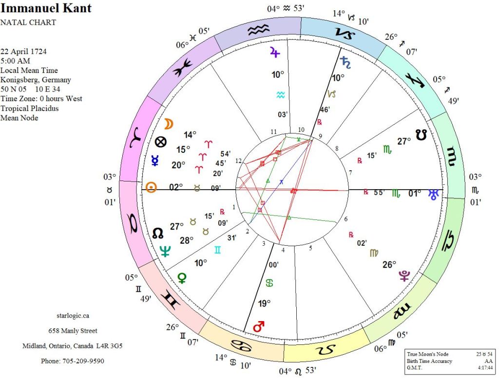 The Kepler 8.0 guide says that Kant’s birth time is from a birth certificate. The fact that the Sun is just above the horizon line implies that someone picked dawn, which is usual when the birth time is not known. So, a grain of salt is needed here. The clear major aspect is a T-square pointing at the Moon (in wide conjunction to Mercury), squared to Mars on the one side and a Saturn/Midheaven conjunction on the other. At the same time, the Sun is in (almost exact) opposition to Uranus. These aspects are the main indicators of a philosopher. And just for good measure, Neptune is conjunct the North Node in Taurus. There is one inconjunct linking Venus and Saturn. Hmm.