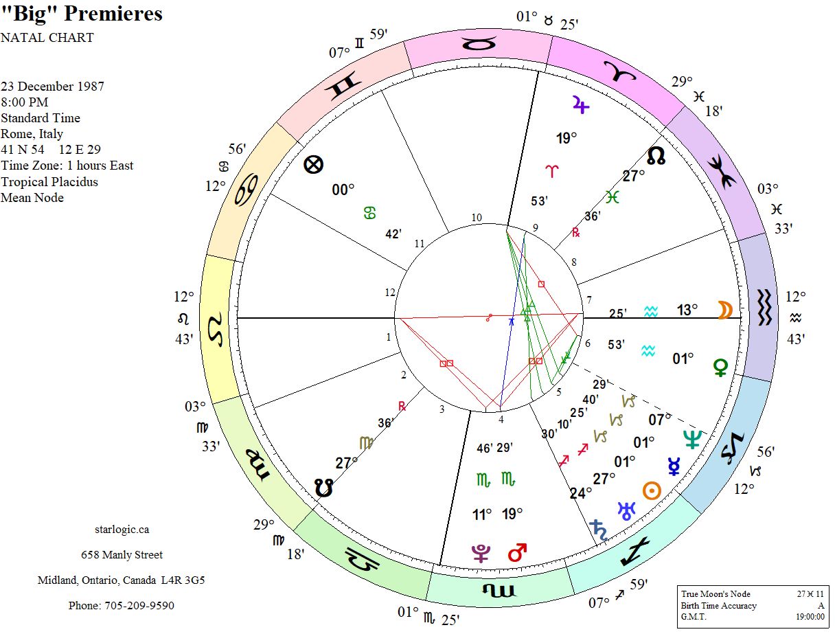 The night of the premiere, another stellium emerged, this time in Capricorn. Notice, too, that the Moon in Aquarius is conjunct the Descendant. There is one inconjunct, linking Mars in Scorpio with Jupiter in Aries. The T-square, this time, has the Moon in opposition to a Leo Ascendant, both square to the Mars/Pluto conjunction. This film was destined to hit the Big time.