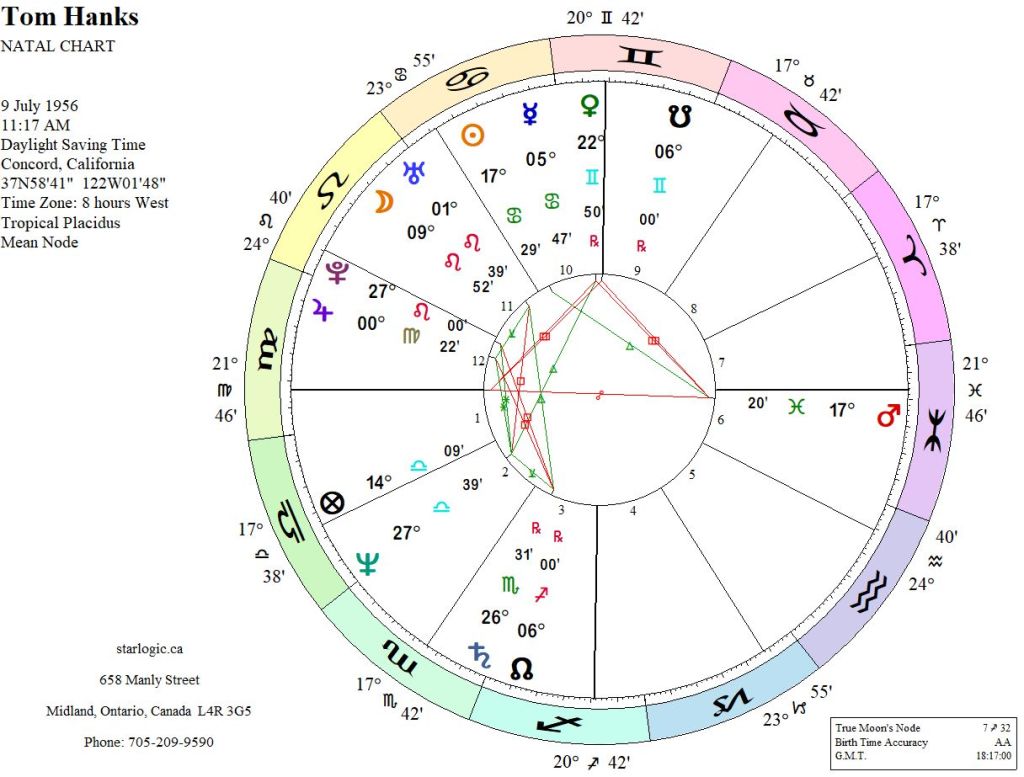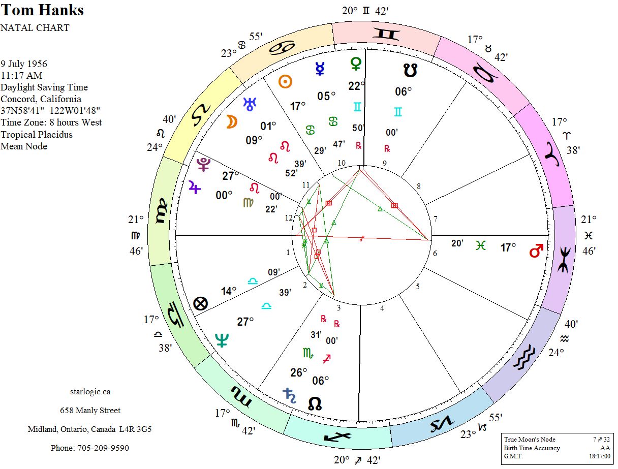 This timing is considered ‘excellent;’. That makes the T-square very potent: Mars (in Pisces) in opposition to a Virgo Ascendant, both square to the Venus/Midheaven conjunction in Gemini. His need for love and approval is paramount to his wellbeing. If you watch his publicity interviews you can see this dynamic in action. His Sun may be in Cancer, but the stellium of planets in Leo (including the Moon) means that he won’t be satisfied until he’s the best. It makes his appearance in A Man Called Otto all the more significant, since he was playing against type (he was a ‘grump’ in other words).